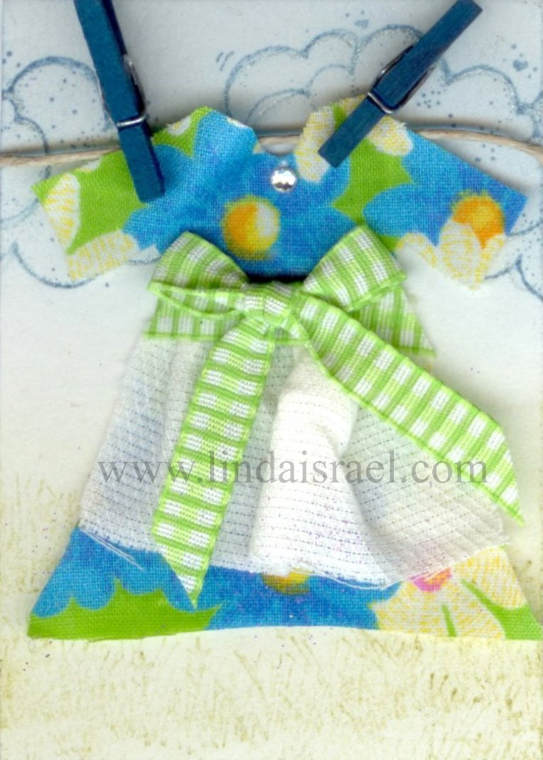 Using jute I created a clothes line and attached the dress with tiny wooden clothes pins. This was attached to the card base using tape on the back of the card.