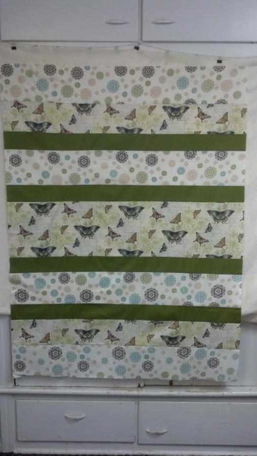 There wasn’t a pattern to follow. For this project I made it up as I went along. Math isn’t my strongest asset, but since I was using 2.5 inch strips this became easy. Starting with a 2.5 inch square I went around that square with different colors of green strips until I had a square. Then I cut three different prints of white into 2.5 inch strips. Sewing three strips together I then cut those into squares that were the same size as the green squares. Playing with the placement of the squares on a design board I made for hours I finally had a design.
