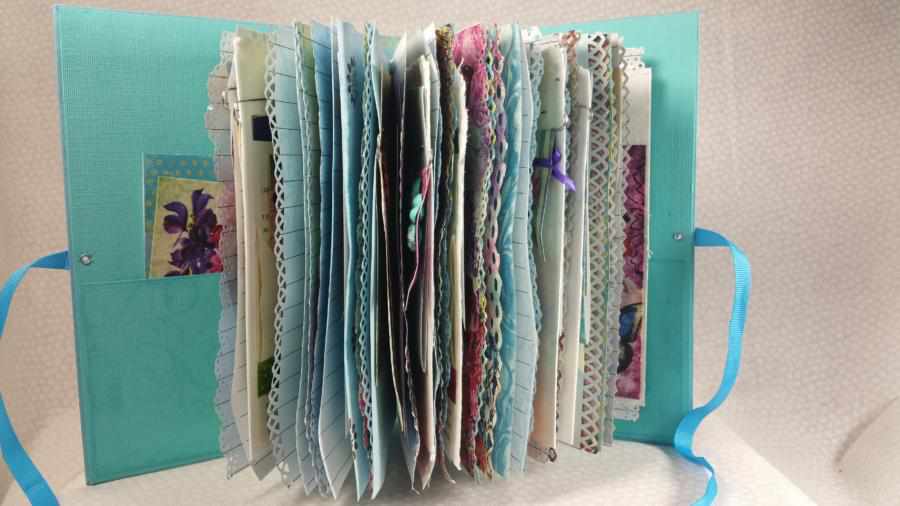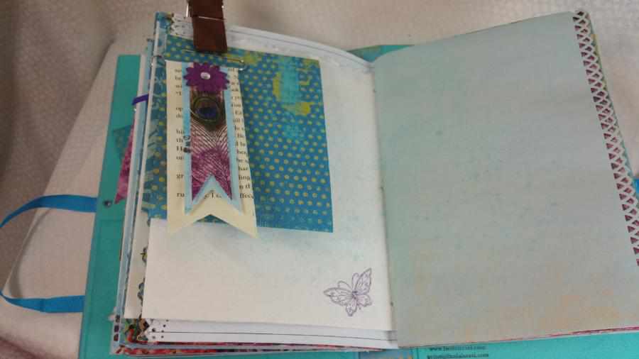 A pretty peacock blue ribbon ties the journal close.