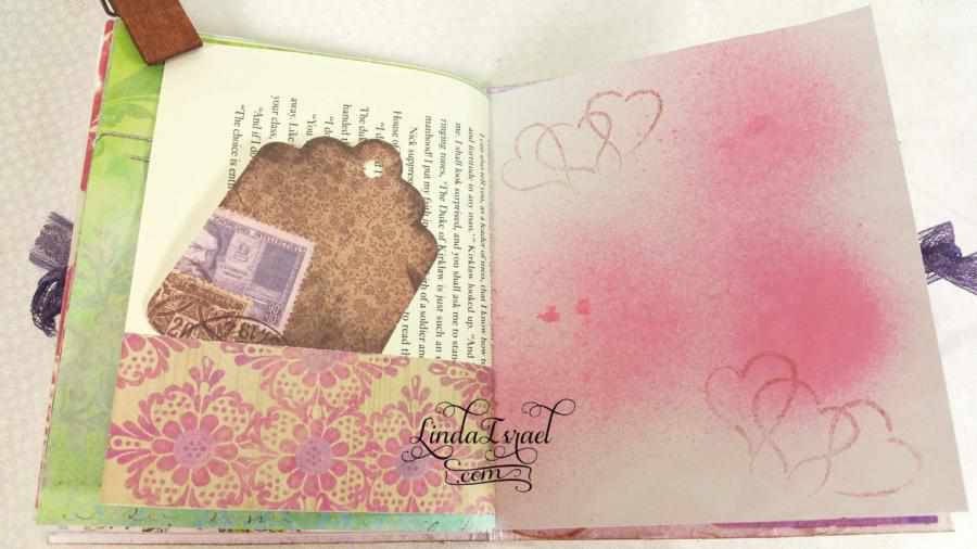 Inside the journals, I used all kinds of scrapbook paper, left over paper, lined notebook paper, graph paper and more. Many of the pages were sprayed with various colors of Tattered Angels Glimmer Mists.