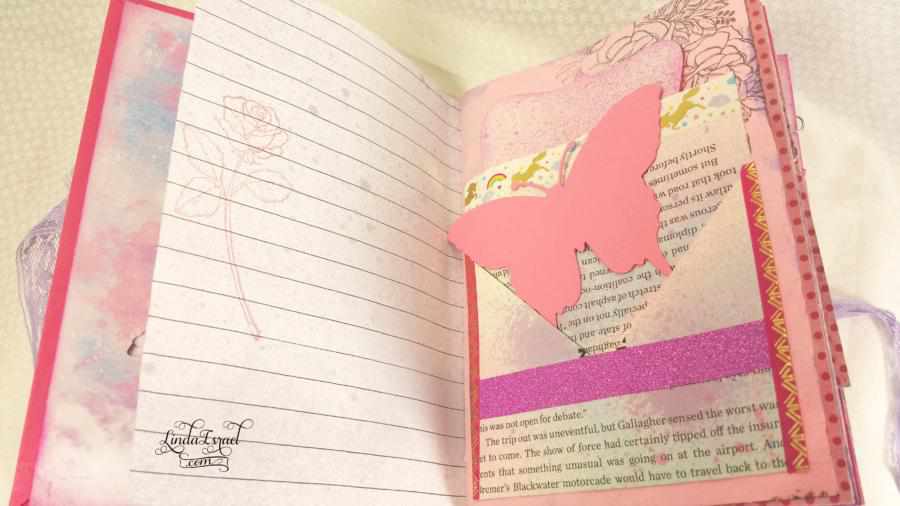 The back inside cover was pretty as it was, but I wanted to cover up the brand name of the cover and add a pocket. The pink foil cardstock scrap that was given to me was perfect for this spot. I then added a tag from Calico Collage’s Amirillo Rose and one from the All About Robins kit.