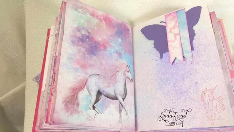 I’m so thankful to my friends who send items to me. Many times I remember who gave them to me and many times I do not. Hopefully if you gave items to me you will understand that sometimes it is hard to keep track of everything. So thank you for your gifts. The dear head note pad paper was one of these gifts. Beside it I used a scrap of napkin that was adhered to a book page. I thought it blended well together. On the right was a stenciled page I created during the video. Using Distress Oxide inks and a blending tool I added lots of color then I sprayed with a couple of colors of Tattered Angels Glimmer mists. The stamped flower and text was the final touch to the page.