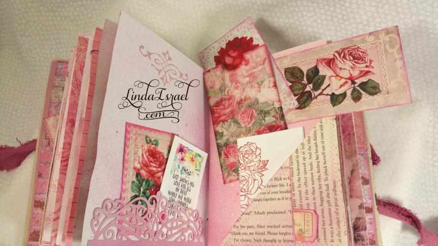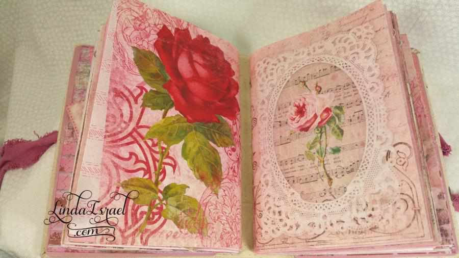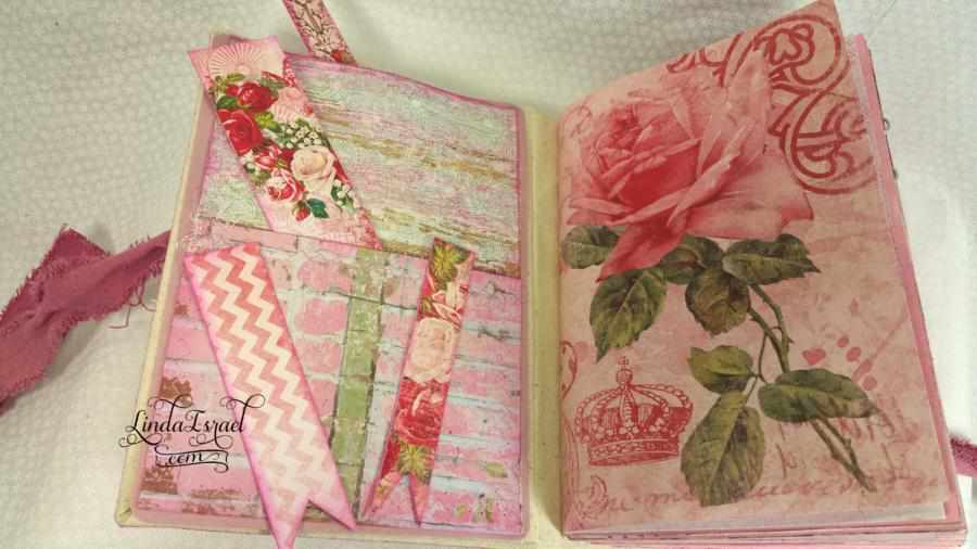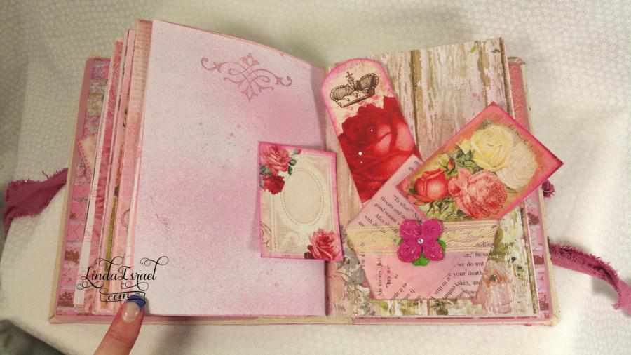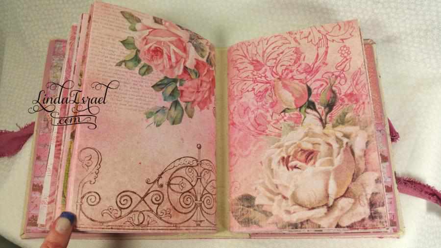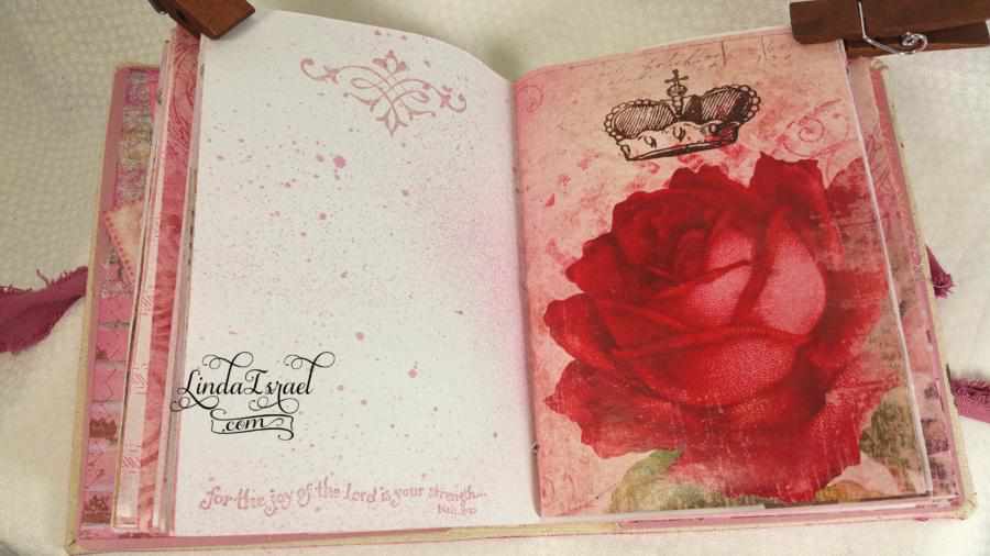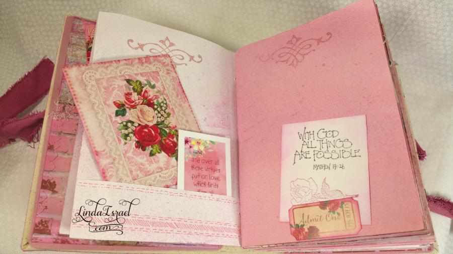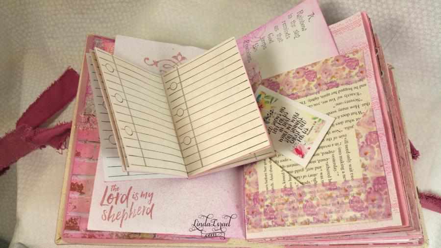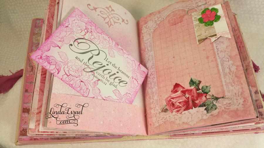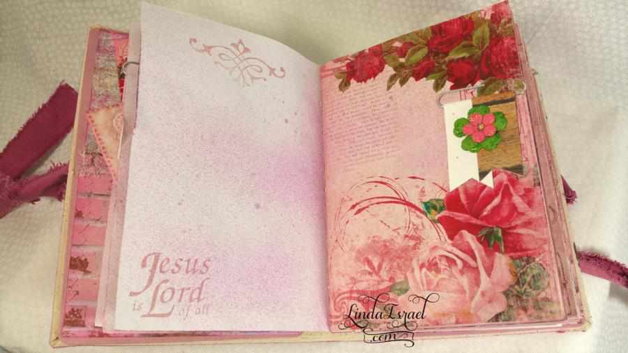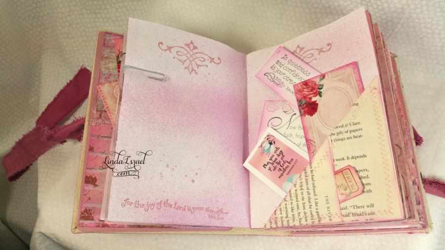 Handmade Pink Grace Prayer Junk Journal, I made using the Calico Collage digital images – Pink Grace. Also used, Tattered Angels Glimmer Mists, Scrapbook papers,