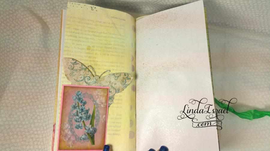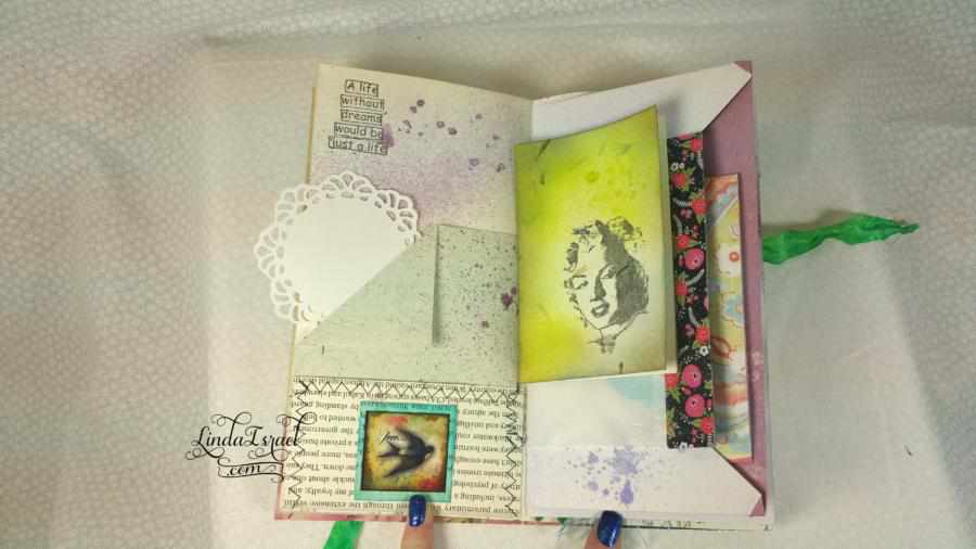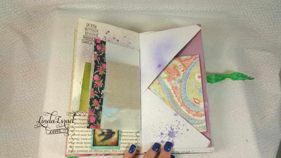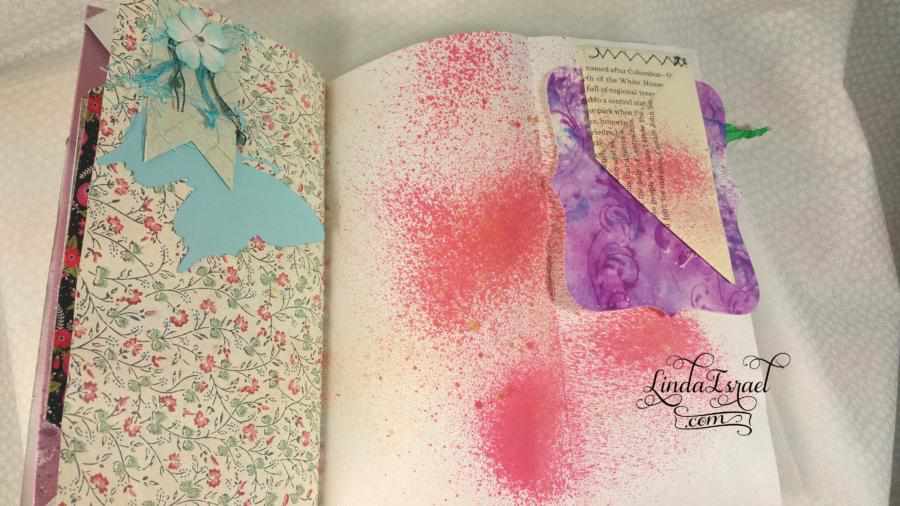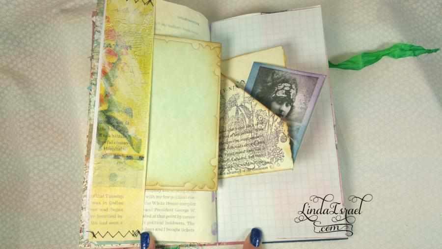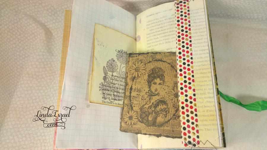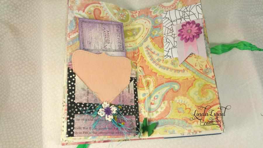 What was also a lot of fun was using things that are not normally book pages – Like the wallpaper sample. Years ago when I was a member of a local Stamp Club we made lots of envelopes out of wallpaper samples. Several of us went to wallpaper stores and asked for their old wallpaper sample books. Many of these stores gave these to us for free. So I have a ton of wallpaper in my stash and it feels good to use some of this.
