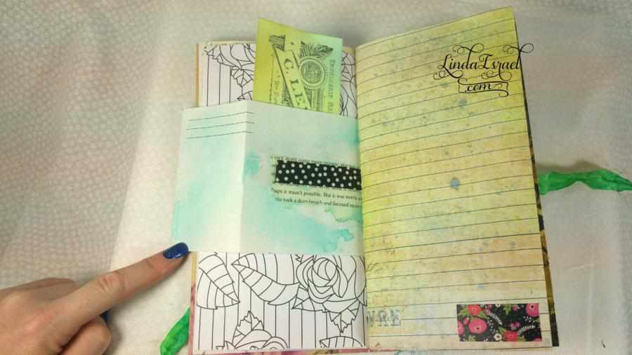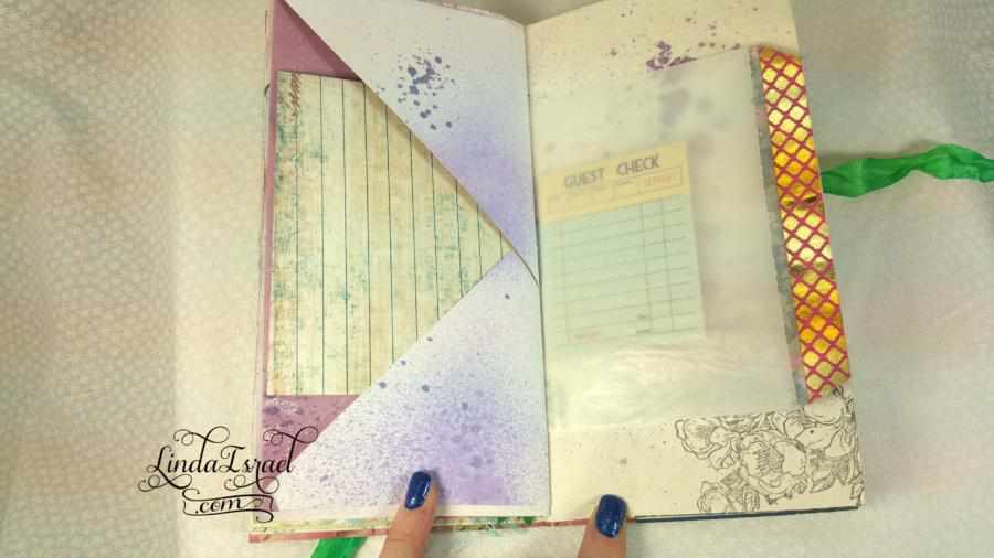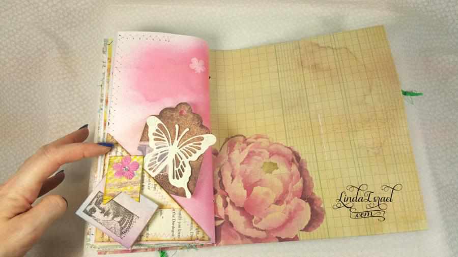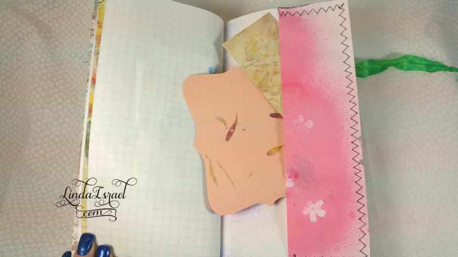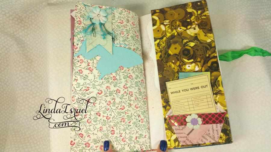 This journal has 9 sheets of various papers folded in half for a total of 36 pages. Several of the pages tip out or have pockets.
