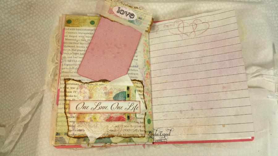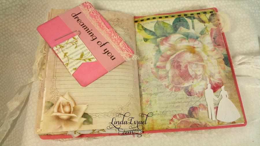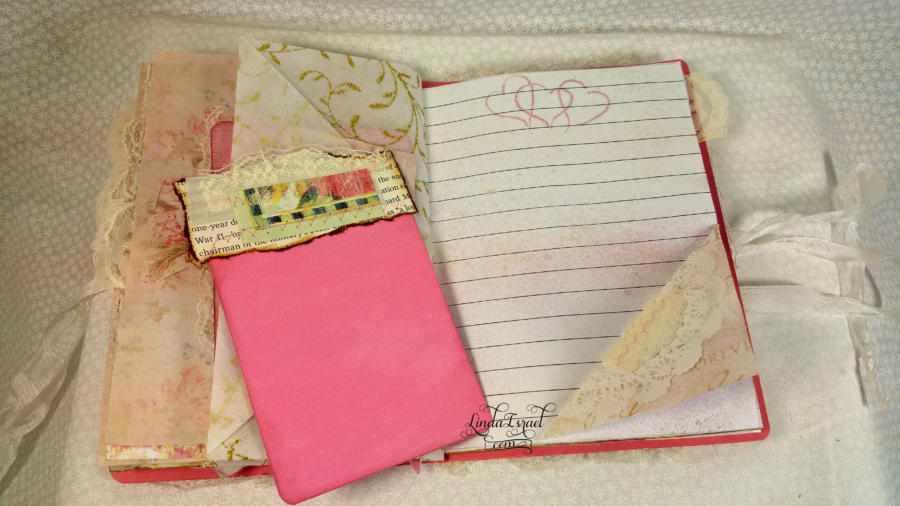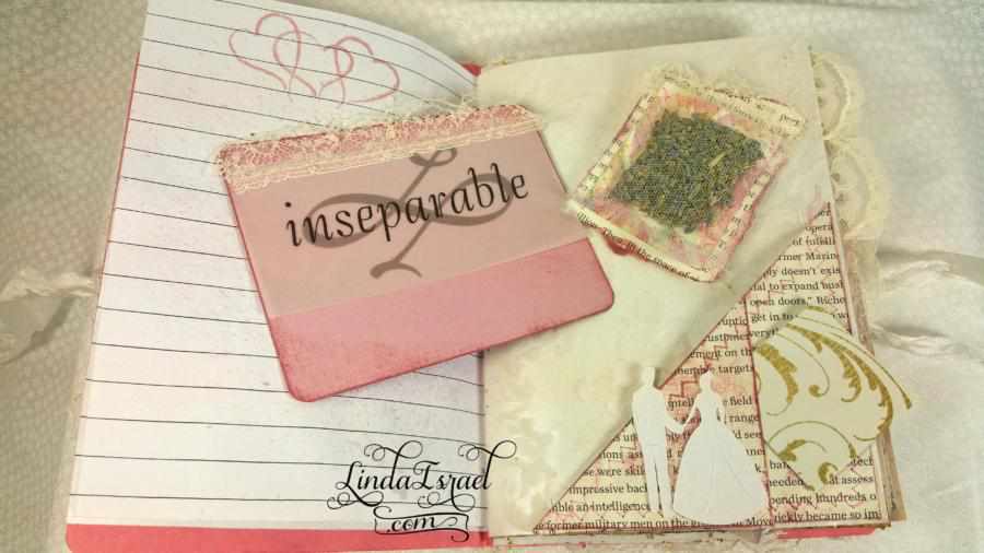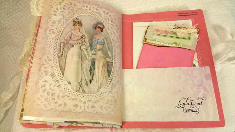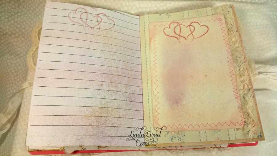 When I cut down the page to fit into my desired size, I had scraps left over. This gave me an idea to make small pockets and to use on the top of tags for journal spots. My sewing machine came in handy for attaching the elements together and I love the texture and feel of romance it adds.
