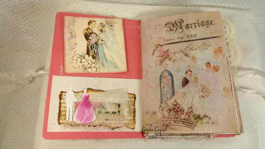 To Have and To Hold Wedding Junk Journal using Calico Collage Digital Images Love Story, Tattered Angels Glimmer Mists, Lace, Scraps of paper, paper napkins and sewing. There is a lot of yummy texture in this To Have and To Hold Wedding Junk Journal.