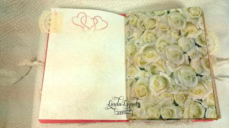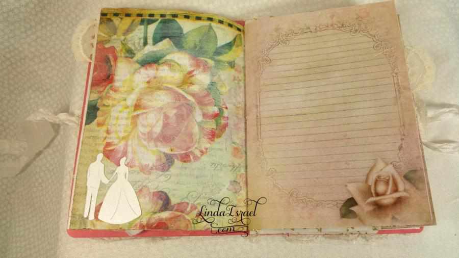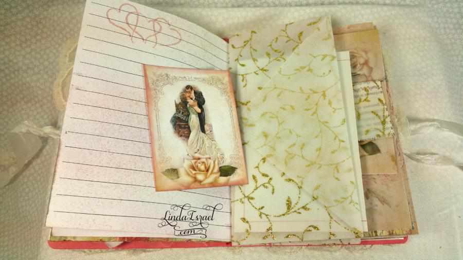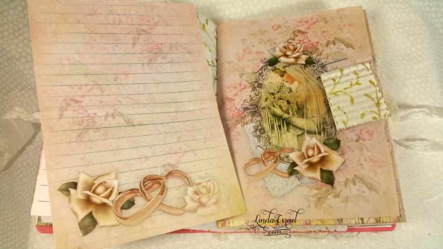 In this To Have and To Hold Wedding Junk Journal I decided to make it with 12 sheets of paper that are folded in half. This makes 48 pages to work with in this junk journal. Measuring 5.25 in x 7.5 in. Lace around the edge of the cover and bits of lace throughout the journal as well.