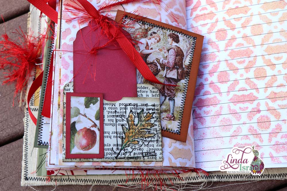 Used the Cricut to cut apple shaped journal cards and tuck spots. These were then sprayed with Tattered Angels and had distress inks added.