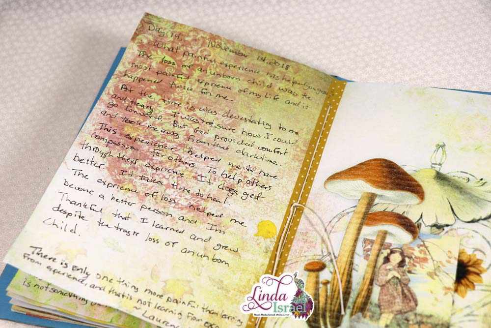 - 8 to 9 Various papers including any digital prints, Mop Up pages, Dictionary pages and more to make up the pages for the journal. 8 pages will give you 32 pages. If you want more writing space then add more pages.