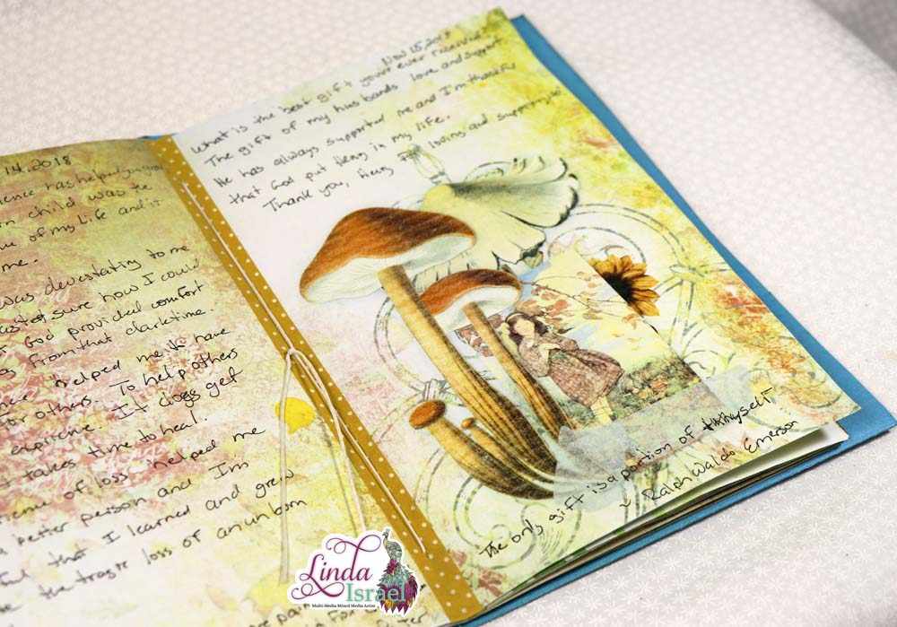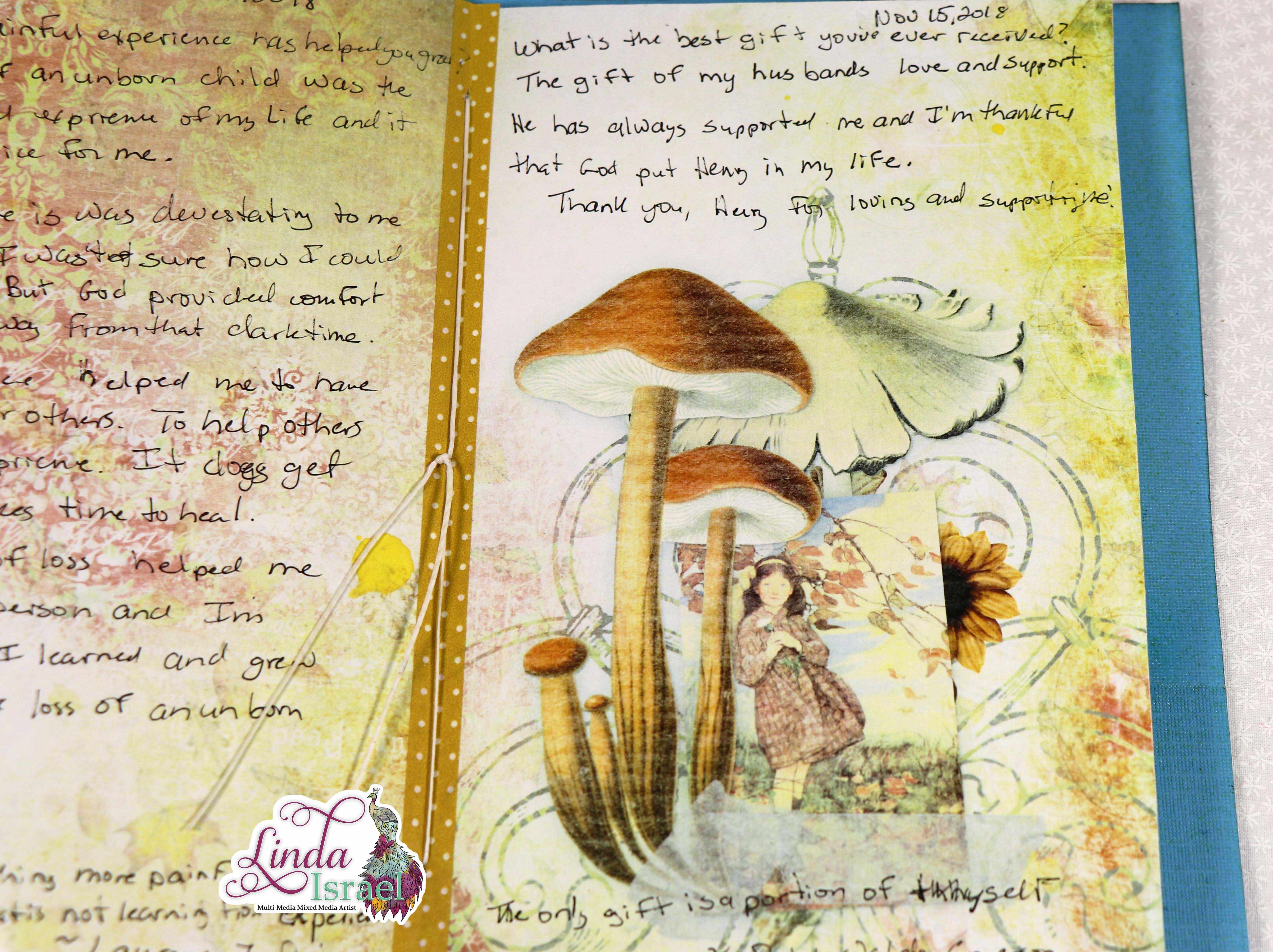 - 8 to 9 Various papers including any digital prints, Mop Up pages, Dictionary pages and more to make up the pages for the journal. 8 pages will give you 32 pages. If you want more writing space then add more pages.