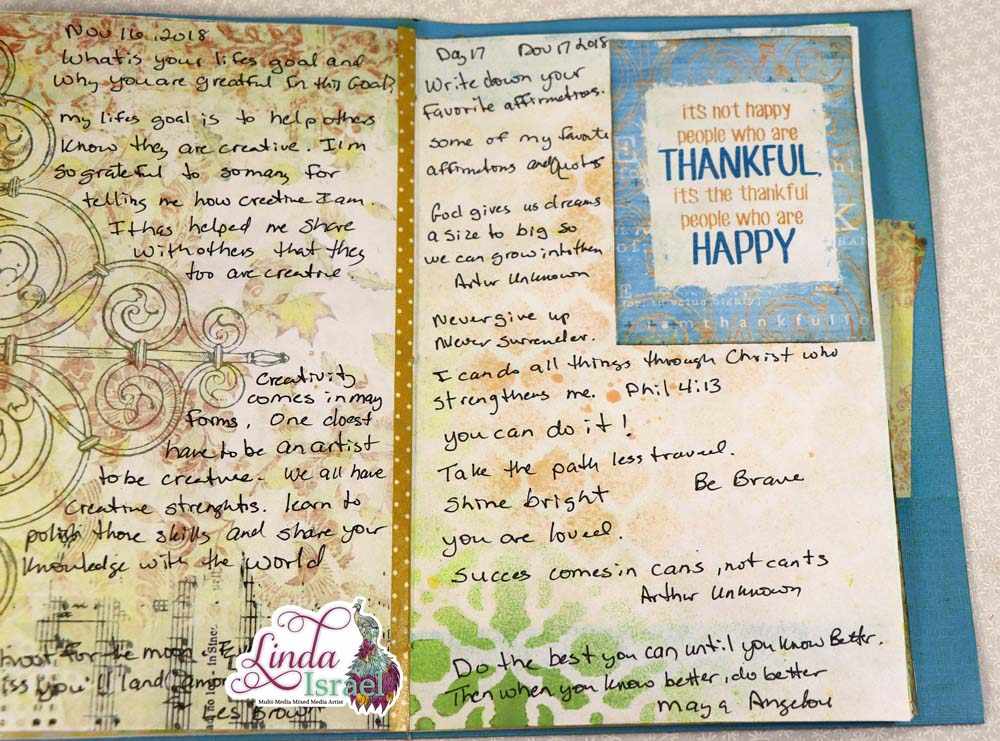 I’m so thankful to my friends who send items to me. Many times I remember who gave them to me and many times I do not. Hopefully if you gave items to me you will understand that sometimes it is hard to keep track of everything. So thank you for your gifts. The dear head note pad paper was one of these gifts. Beside it I used a scrap of napkin that was adhered to a book page. I thought it blended well together. On the right was a stenciled page I created during the video. Using Distress Oxide inks and a blending tool I added lots of color then I sprayed with a couple of colors of Tattered Angels Glimmer mists. The stamped flower and text was the final touch to the page.