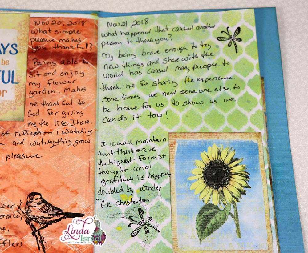I’m so thankful to my friends who send items to me. Many times I remember who gave them to me and many times I do not. Hopefully if you gave items to me you will understand that sometimes it is hard to keep track of everything. So thank you for your gifts. The dear head note pad paper was one of these gifts. Beside it I used a scrap of napkin that was adhered to a book page. I thought it blended well together. On the right was a stenciled page I created during the video. Using Distress Oxide inks and a blending tool I added lots of color then I sprayed with a couple of colors of Tattered Angels Glimmer mists. The stamped flower and text was the final touch to the page.