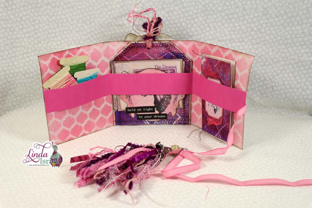 Place items in the Needlebook cover. Embroidery Floss holders are super cute and can have pretty colors, add a few on the left side of the book cover. In the center slide the Exquisite Dreamer Tag. On the right slide the needle book into the band.