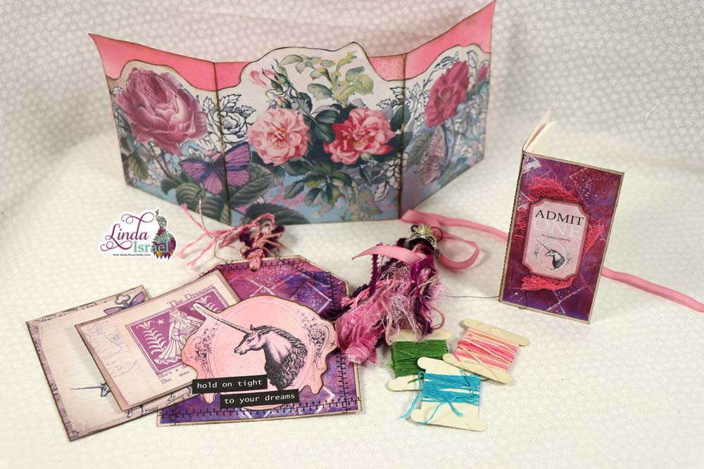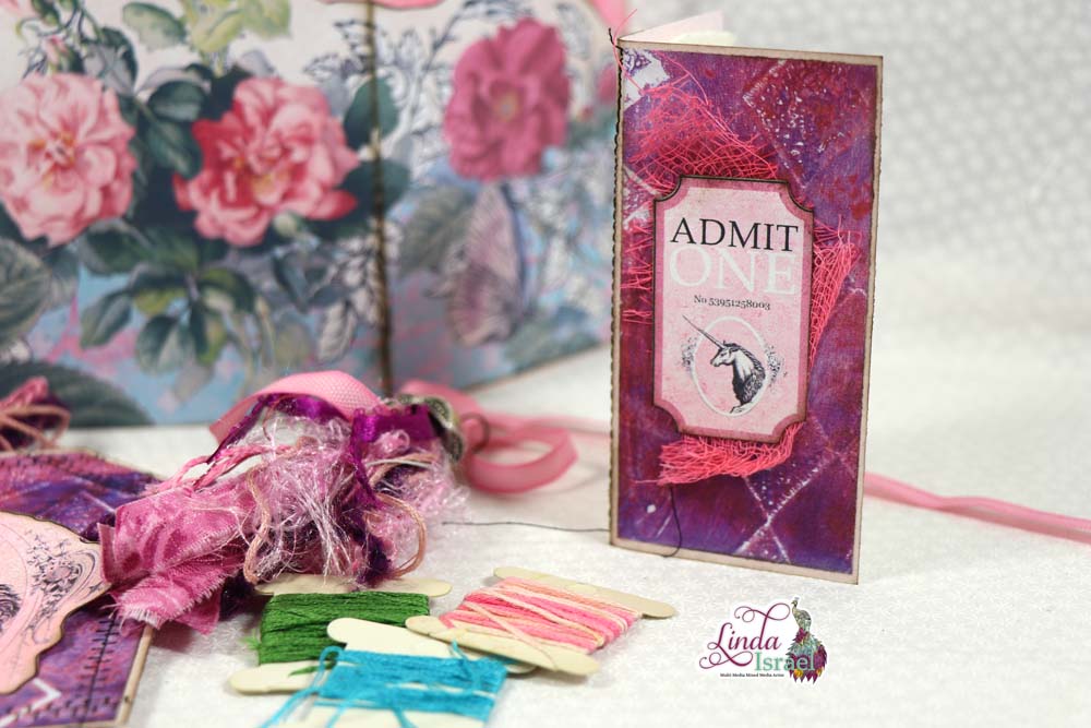 Decorate the cover of the 4 x4 now 2 x 4 book. Adhere a scrap of Pink Gel Print (this is a digital download in my shop) to the book, with Aleenes Tacky Glue. Cut a scrap of cheesecloth about 1.75 x 3 inches. Spray cheesecloth with Pink Poodle Glimmer Mist. Select the unicorn ticket and layer on top of the cheesecloth. Add needle, pins and a safety pin on the quilt batting. Could also add little buttons.