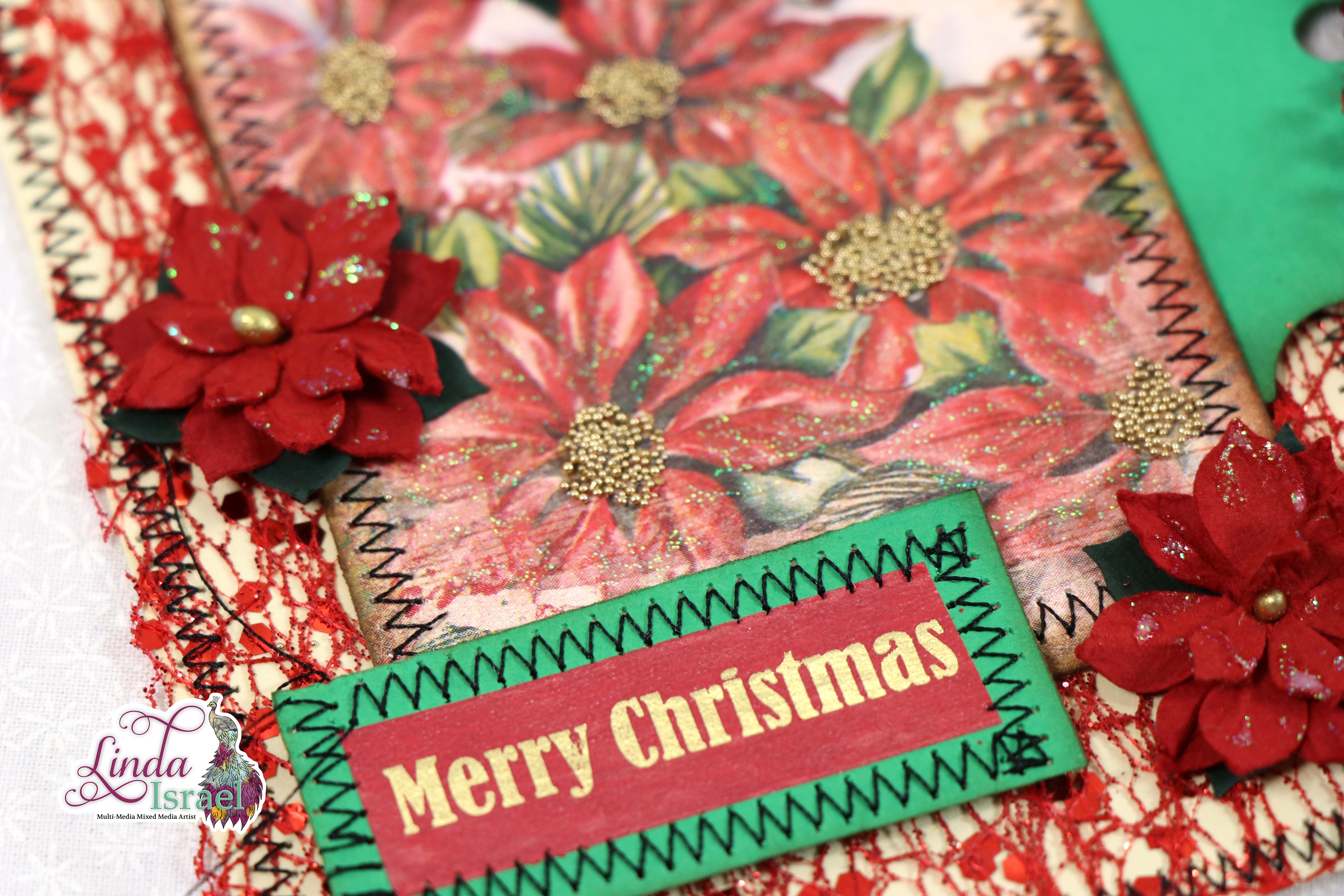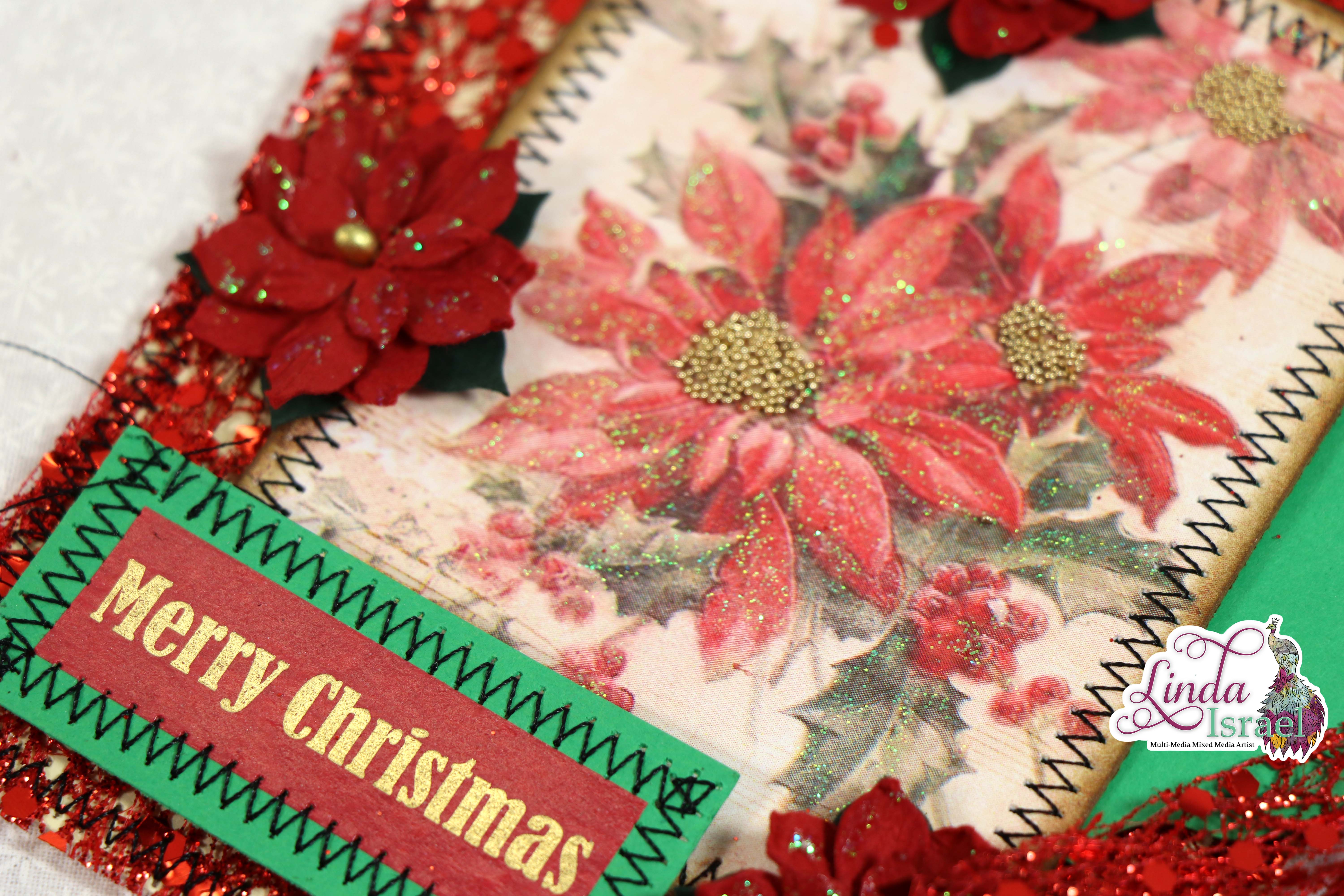 Apply Distress ink to the journal card image from Calico Collage. Apply Merry Christmas Washi Tape to a scrap of green paper to create a little mat. Sew a zig zag stitch around these two elements.