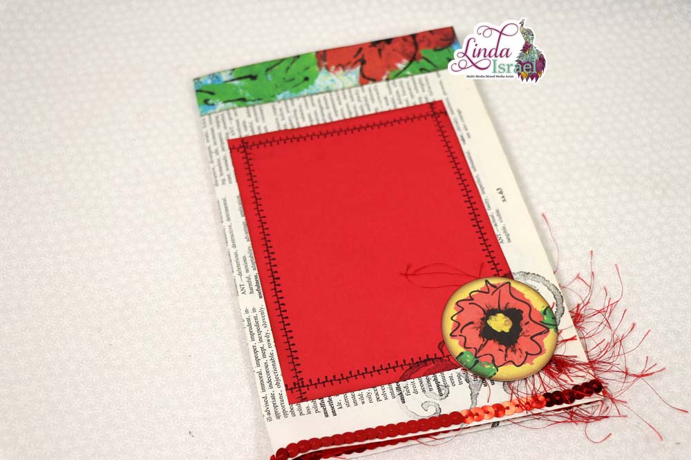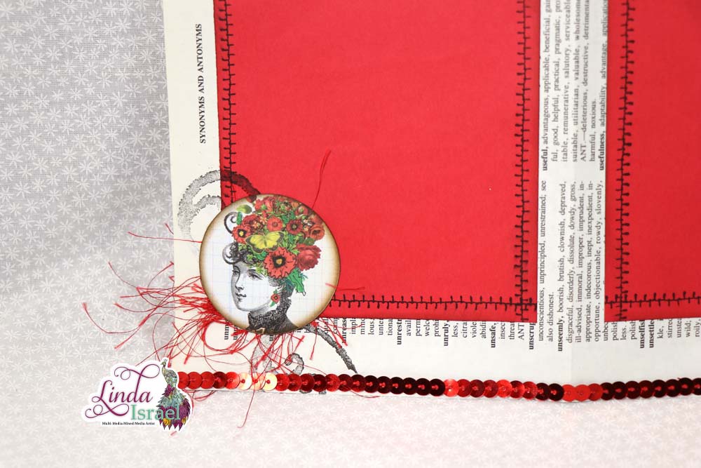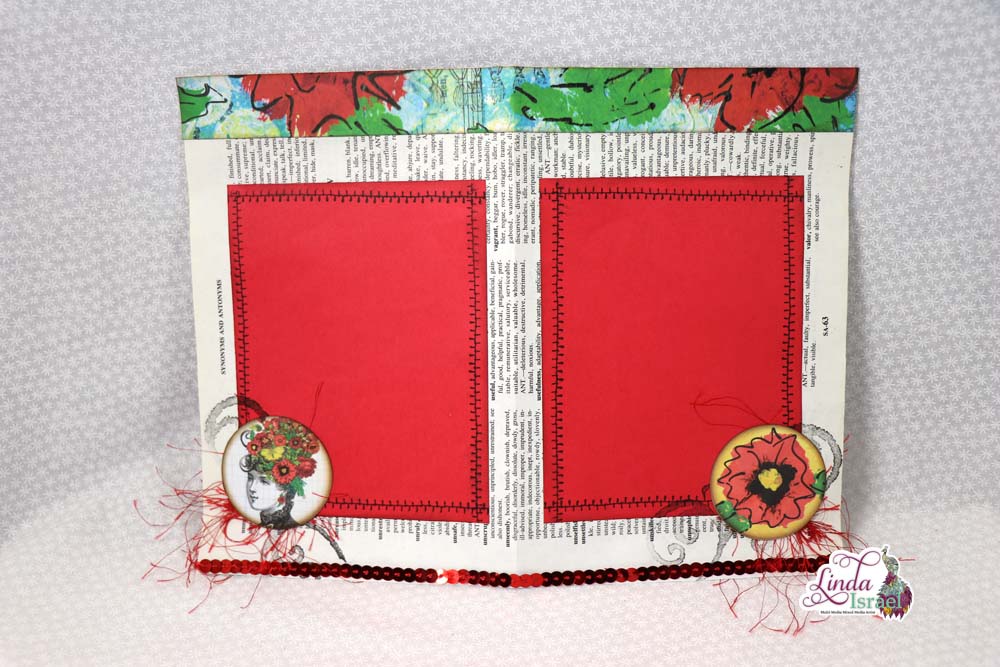 Cut a piece of red copy paper into fourths. Each piece should be about 4.25 x 5.5 inches in size. Stamp using black ink and one of the Shabby Stitches designs near the edge to give the appearance of stitches around each piece of paper. Fold the book page in half to make a 5.5 x 8.5 page, Adhere one red block to each of the four sides of the paper.