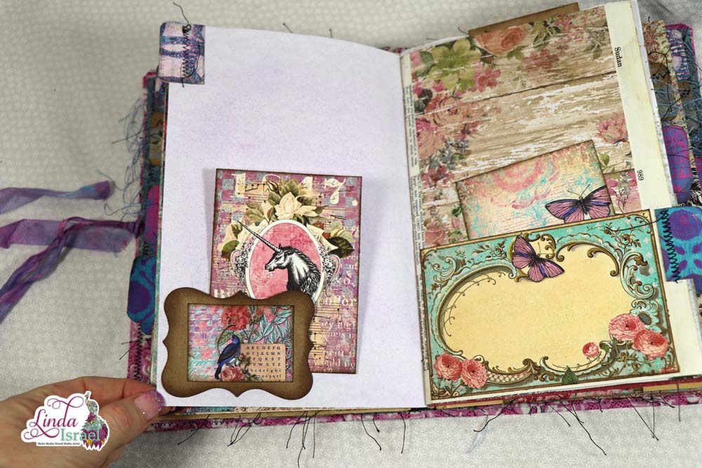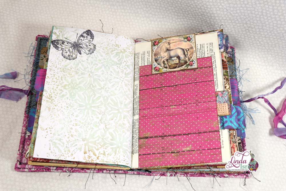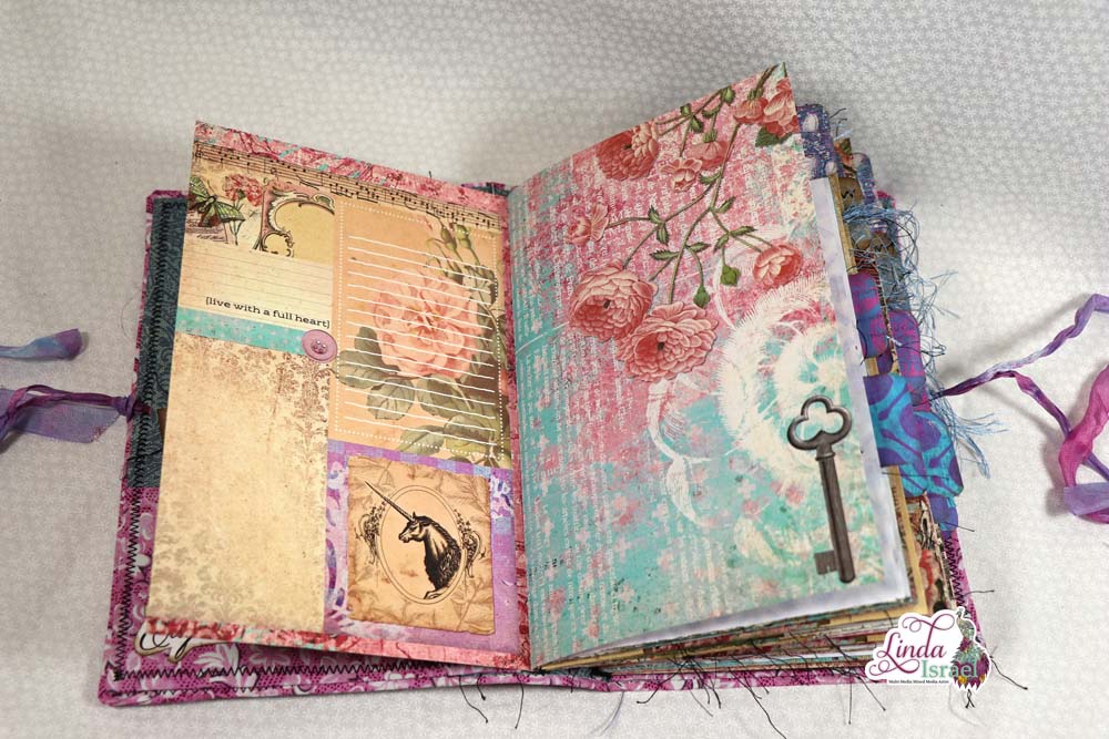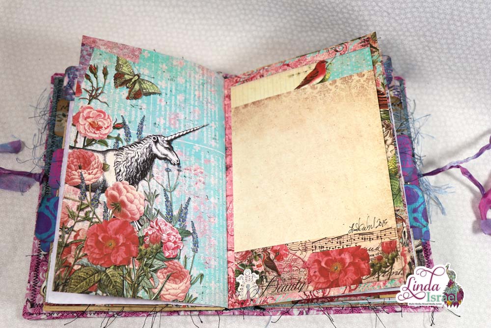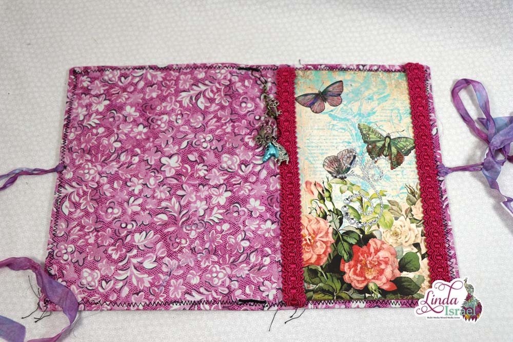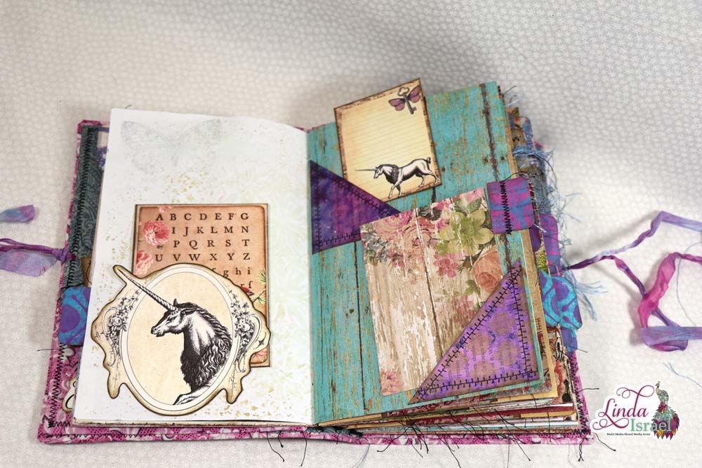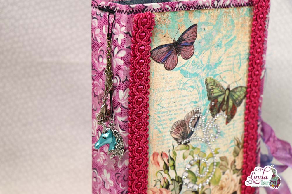 This cover is made using chipboard, fabric, cardstock, trims and some bling. The elastic bands are perfect to hold the journal inserts in place. When I saw the Unicorn charm I just had to add it to this journal.