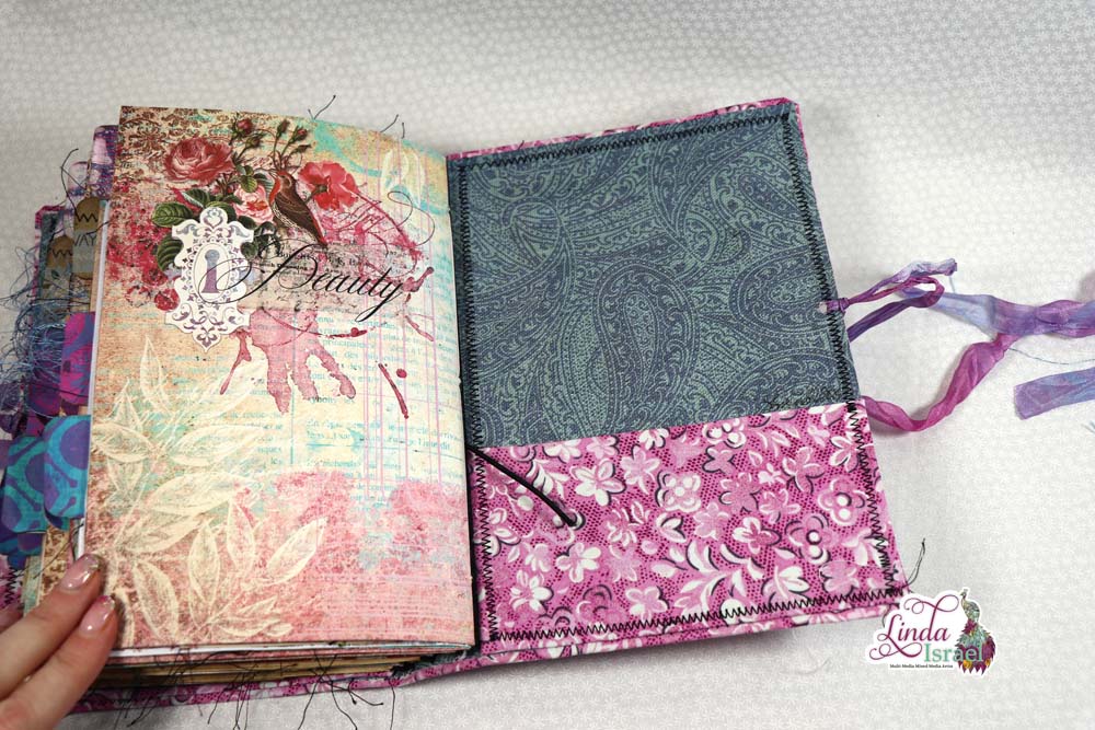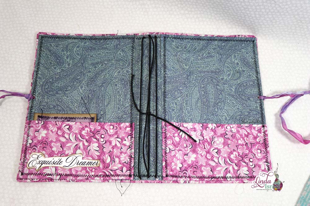 The inside pocket of the journal cover is fabric with the title adhered on top.