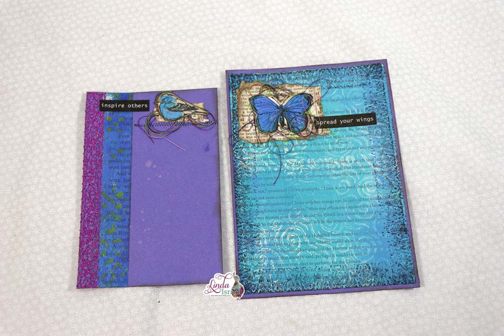 Try to layer your journal cards with stamped images like the White Glider and Bird Lovers Rubber Stamps, book pages, old sewing thread and inspirational words. Also, think about stamping the edges of your journal cards and edges to your junk journal page. Here you can see that Linda used the Textured Edges rubber stamp set.