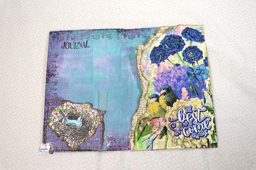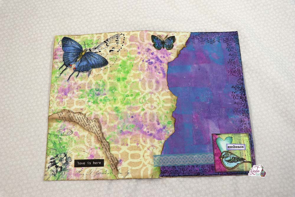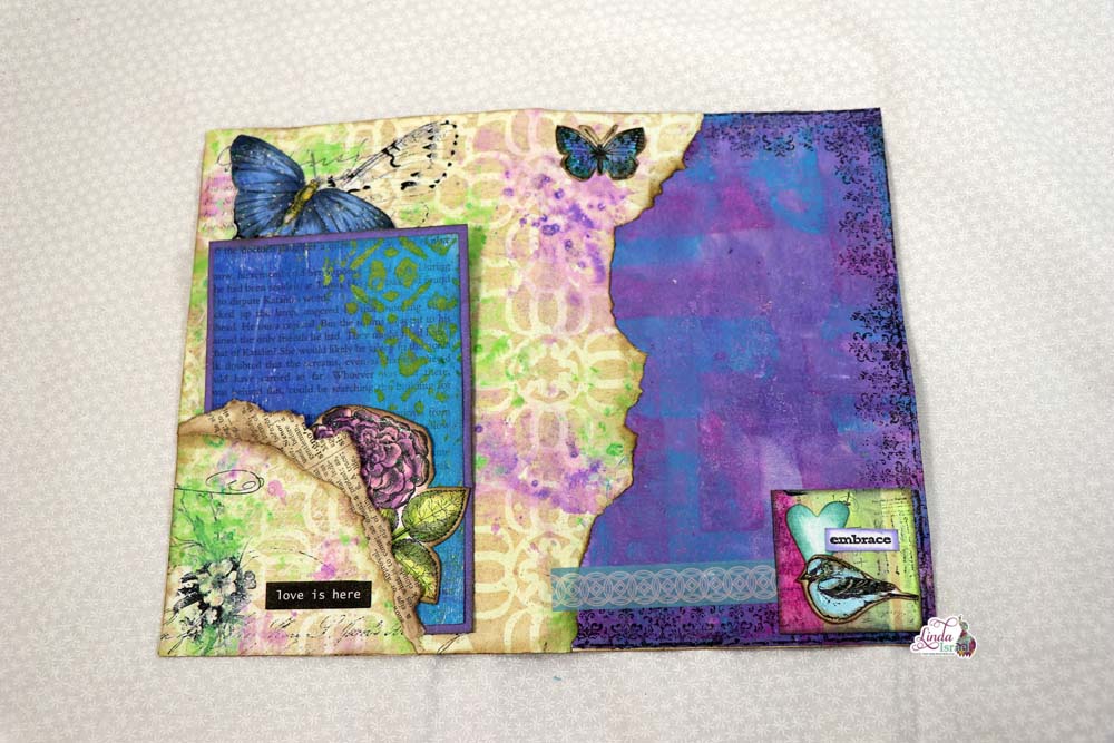 During the tutorial, Linda created a mixed media junk journal page by using her gel prints with various rubber stamped images and then paired them with torn book pages to make a fun mixed media page.