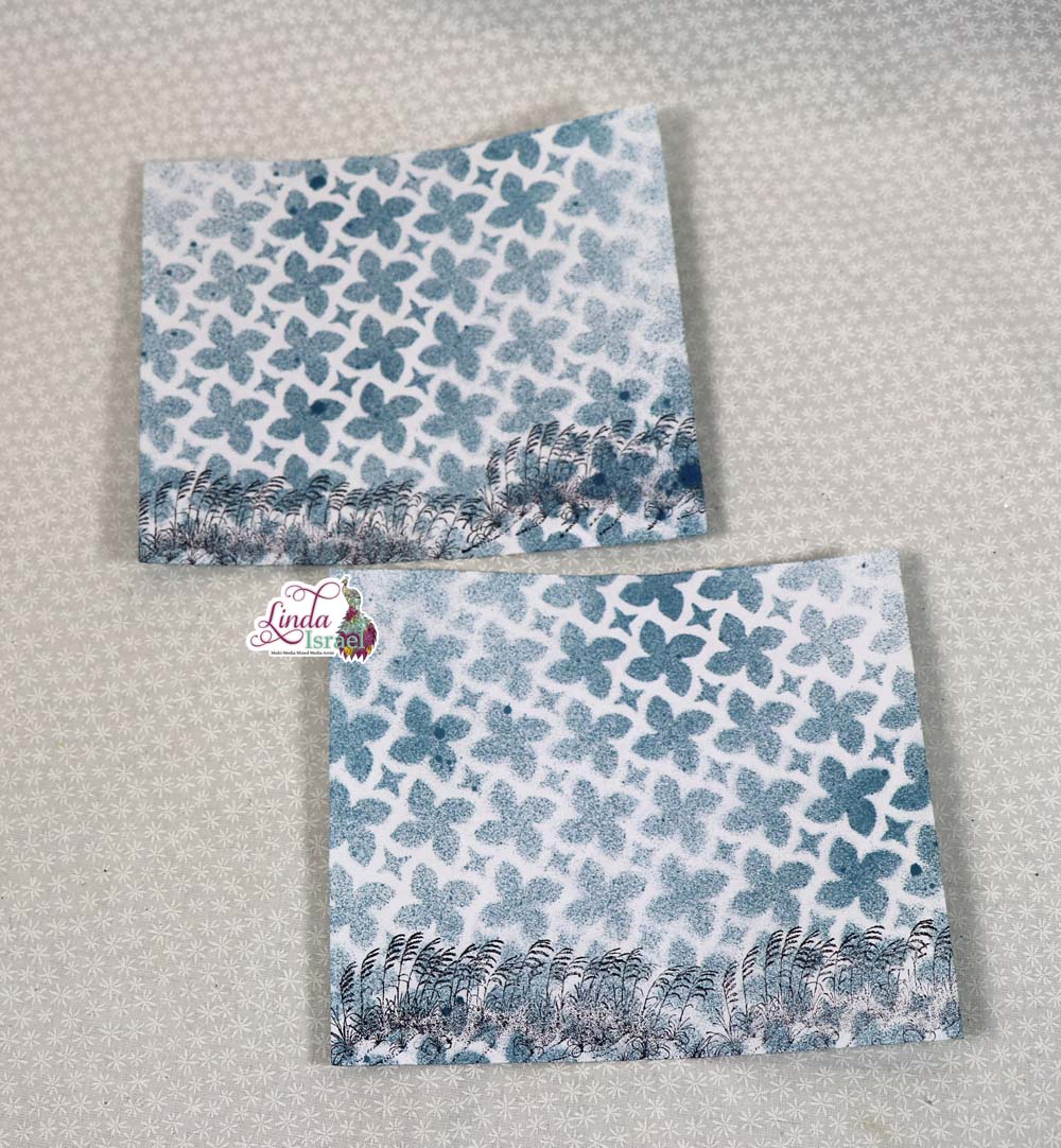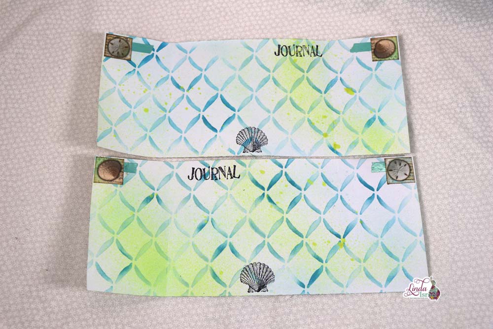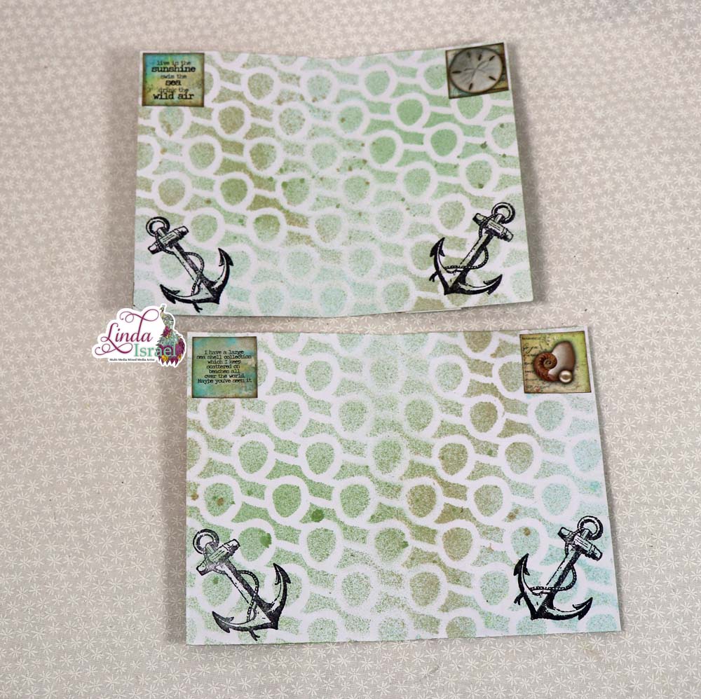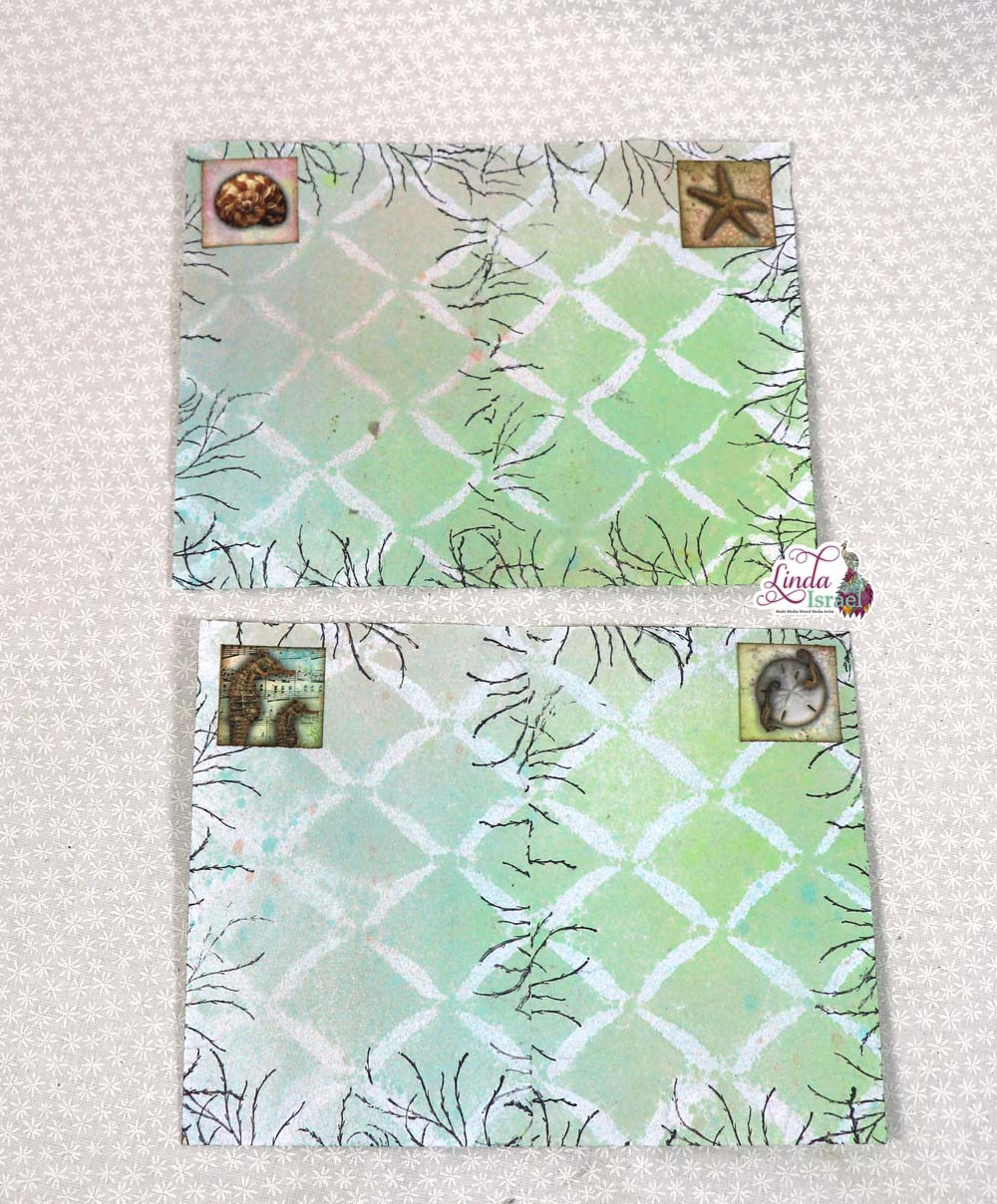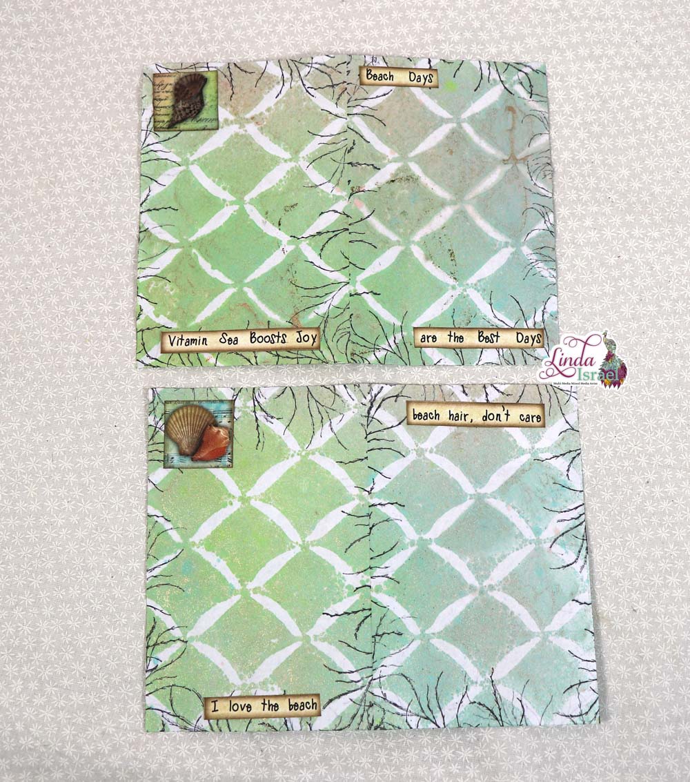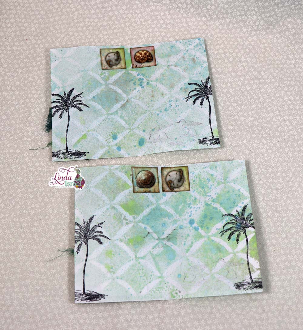 Creating this junk journal page using the net stencil and sprayed with tattered angels glimmer mist. Linda used the swaying palm rubber stamp, then added sea shell 1″ x 1″ seashell digital images by Calico Collage.