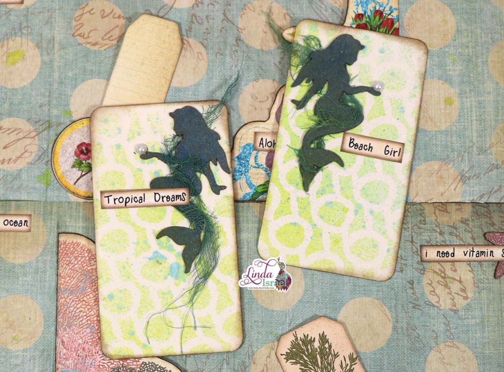 During this tutorial, using the digital images from Calico Collage Linda shows how she completed two Mini Sea Breeze Junk Journals using stencils, tattered angels glimmer mists, and various stamps from her shop.