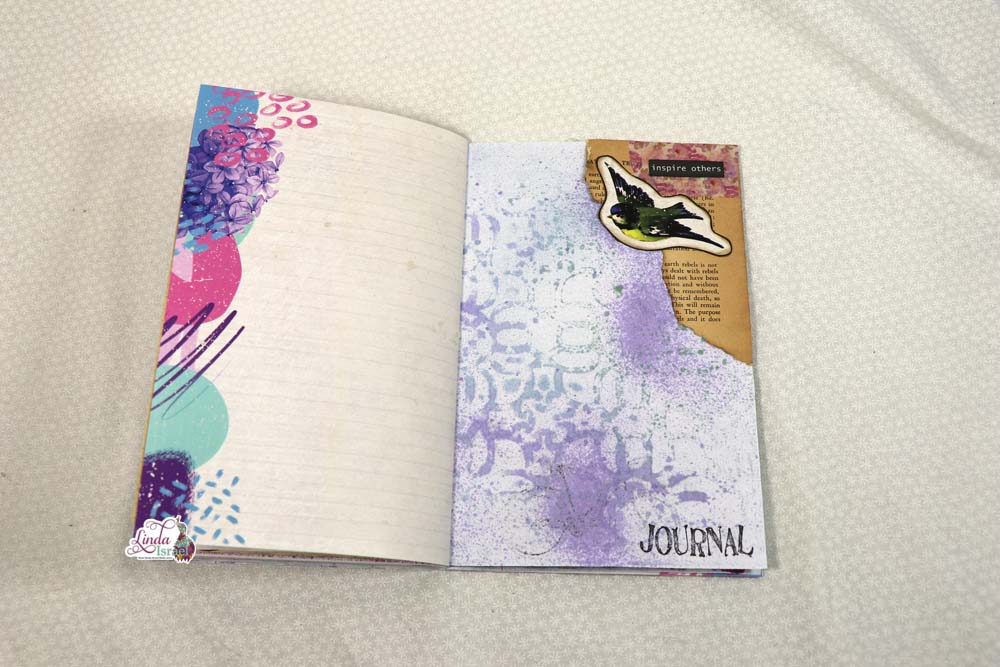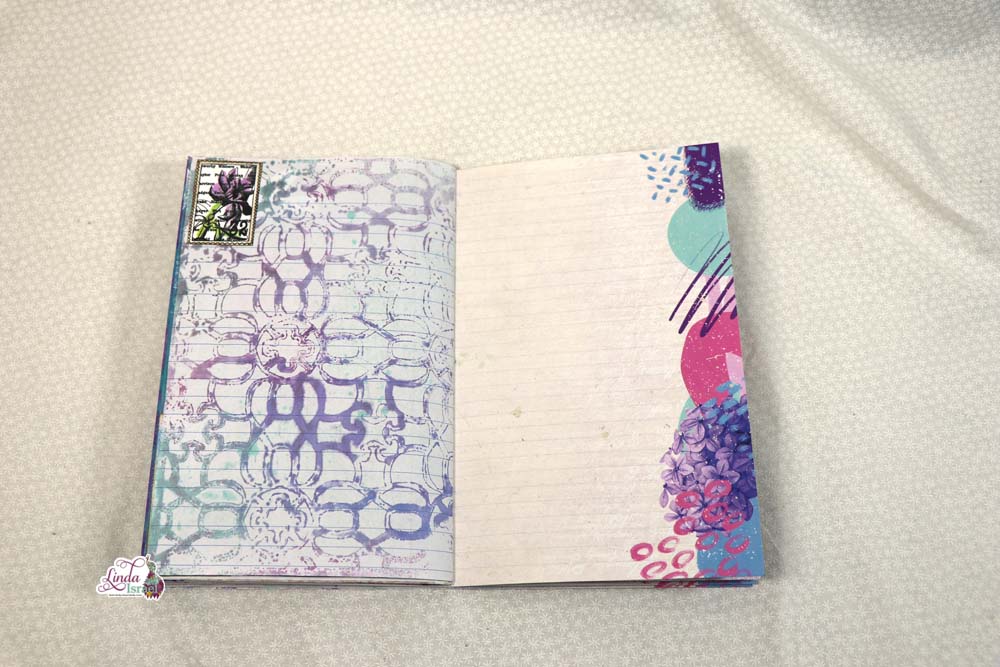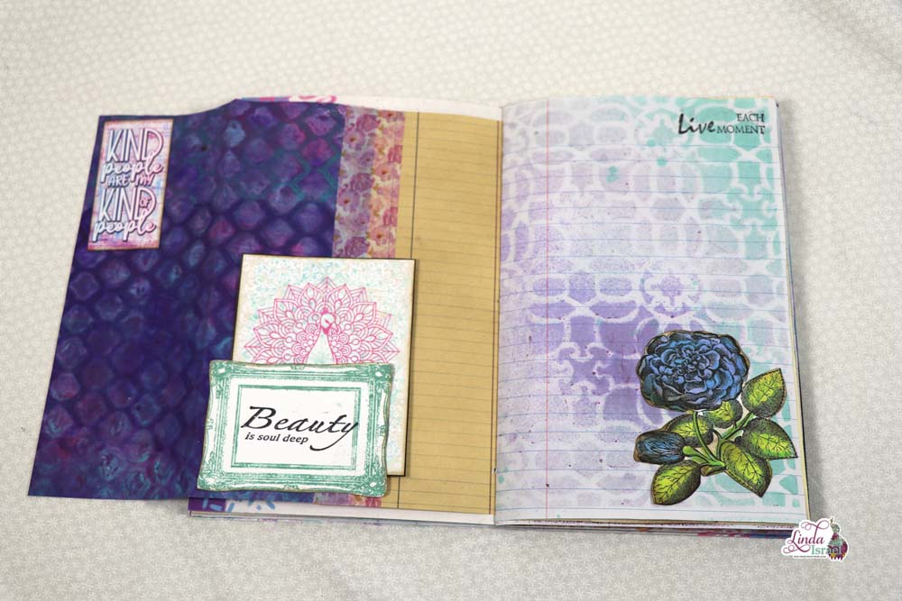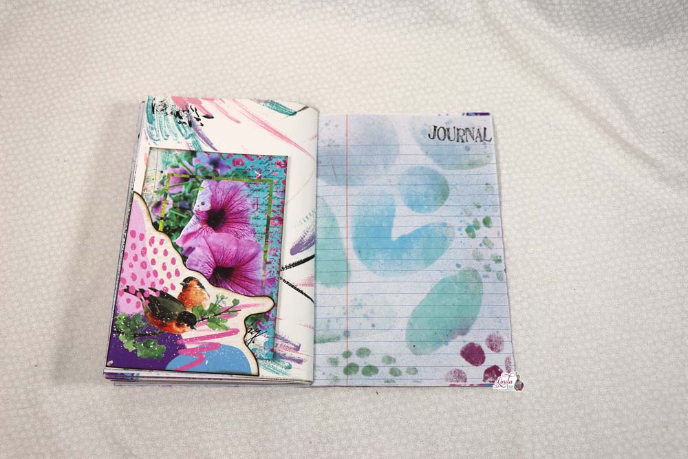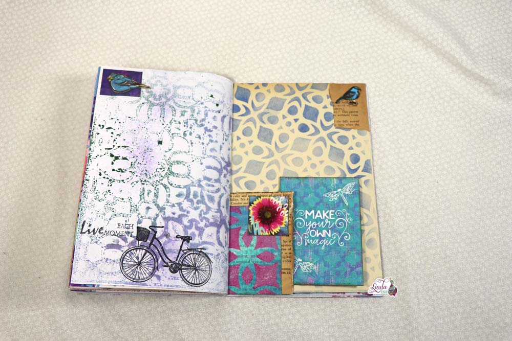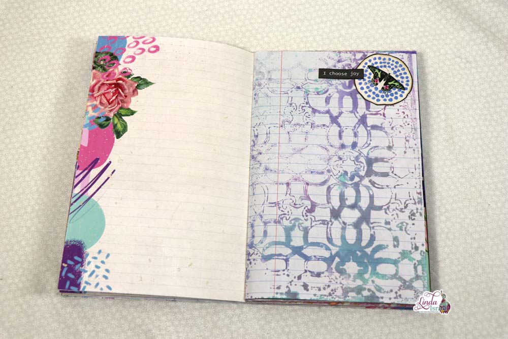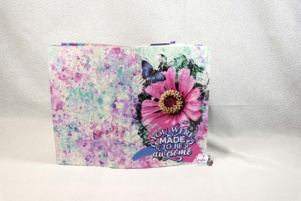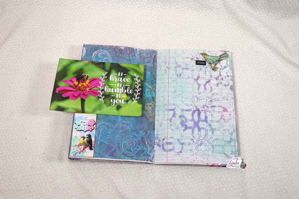 The journal card is a photo from Linda’s garden which was enhanced by Calico Collage, it is included with the Positive Vibes Subscription Box. The background is a stencil which is also included in the kit.