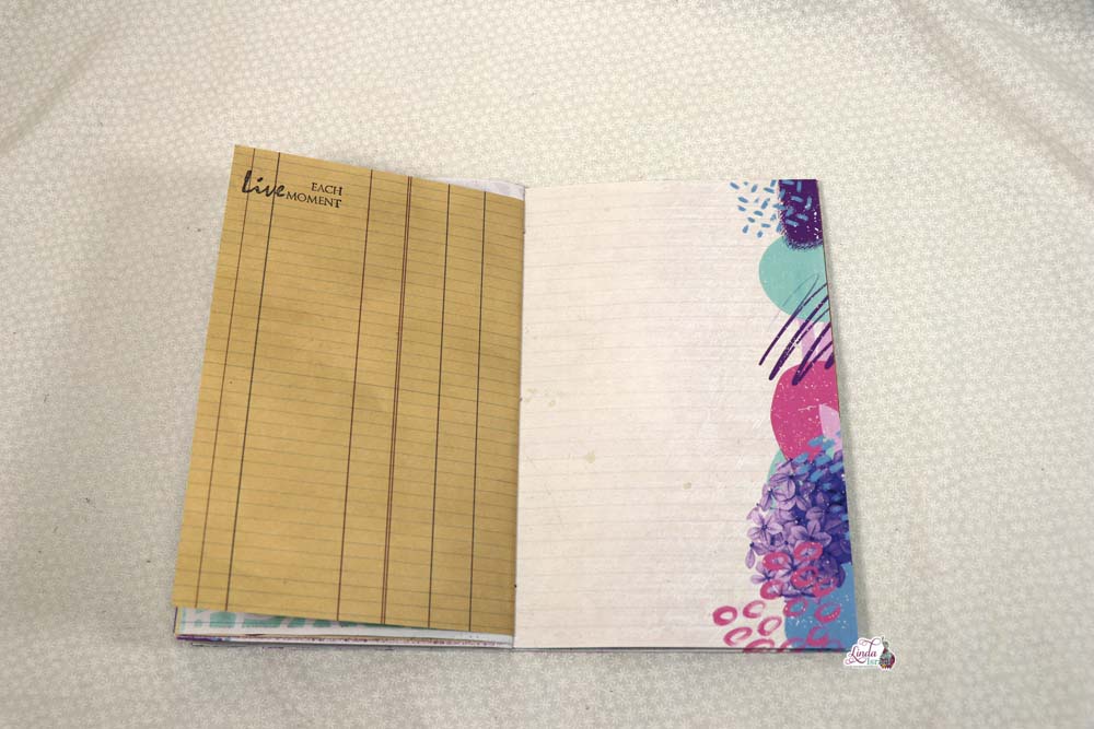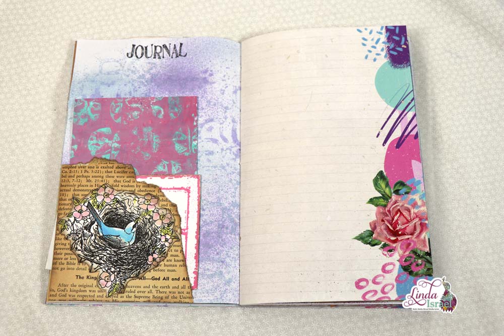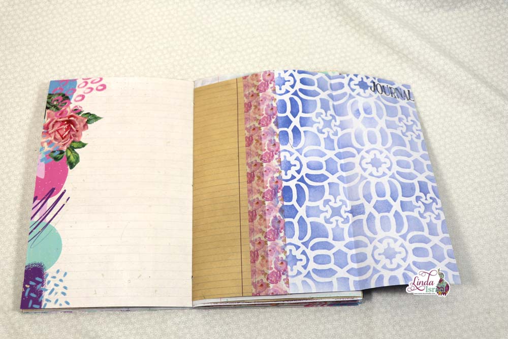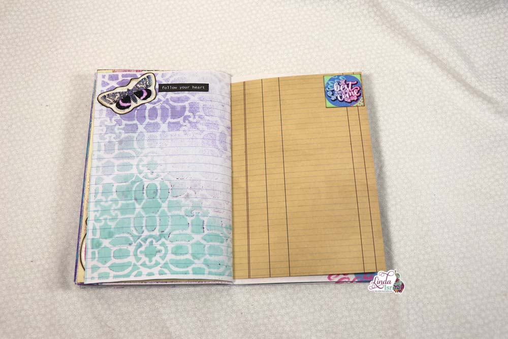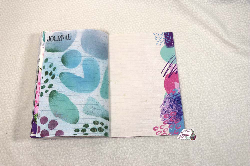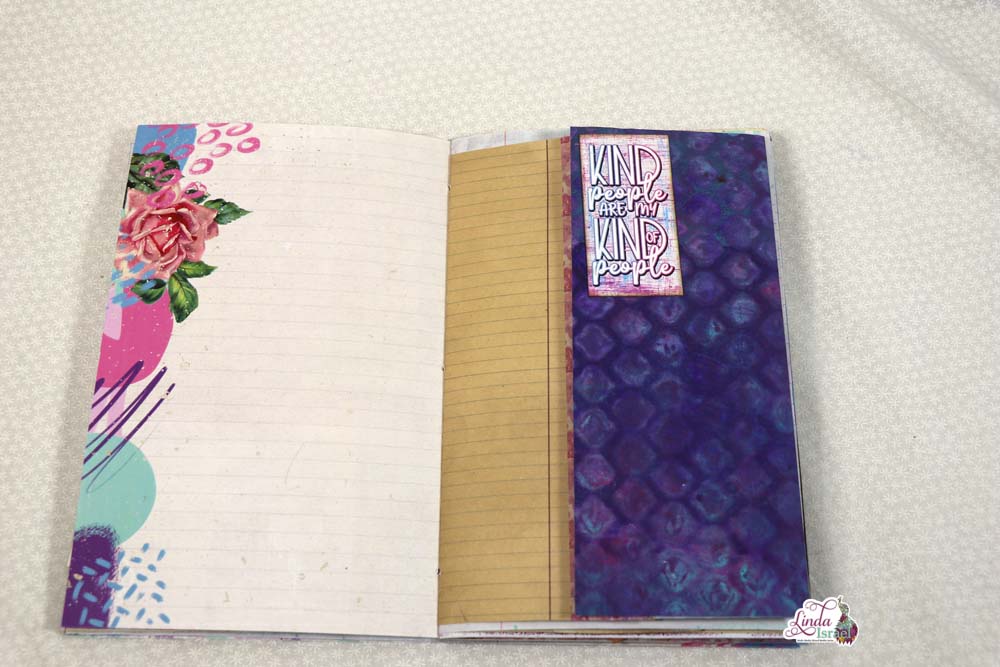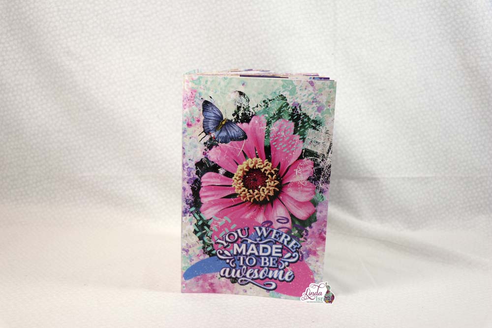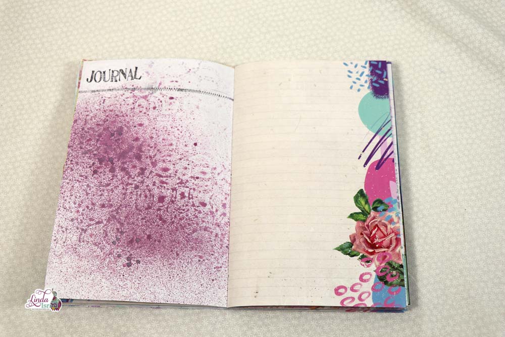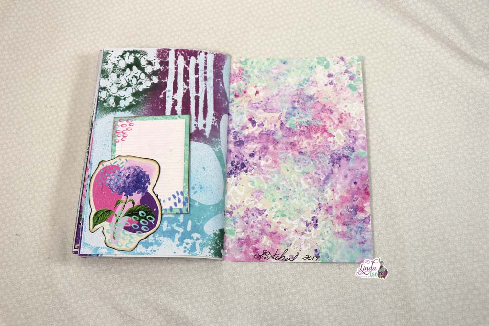 The journal card is a photo from Linda’s garden which was enhanced by Calico Collage, it is included with the Positive Vibes Subscription Box. The background is a stencil which is also included in the kit.