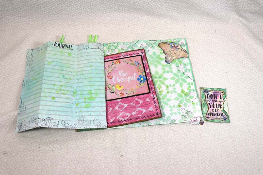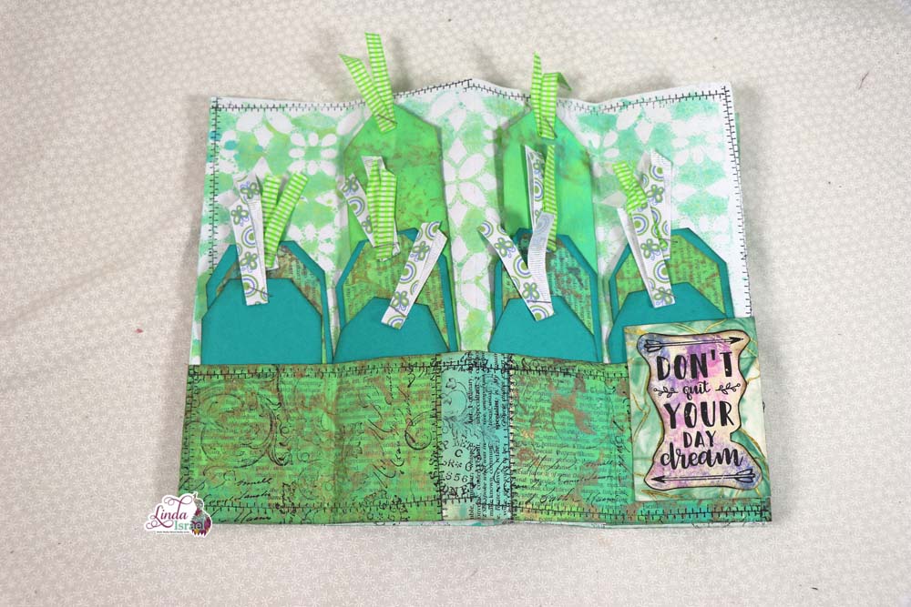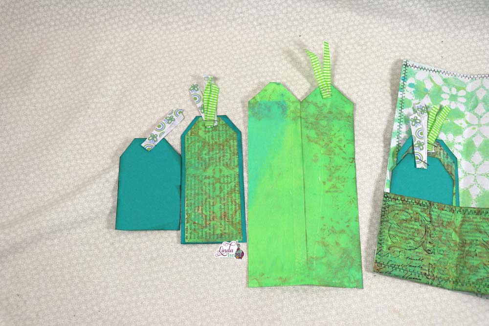 Once all the pockets are in place then choose items to put in the pockets. I made a journal card during the live stream. After the live I created a tag using one of the painted papers.