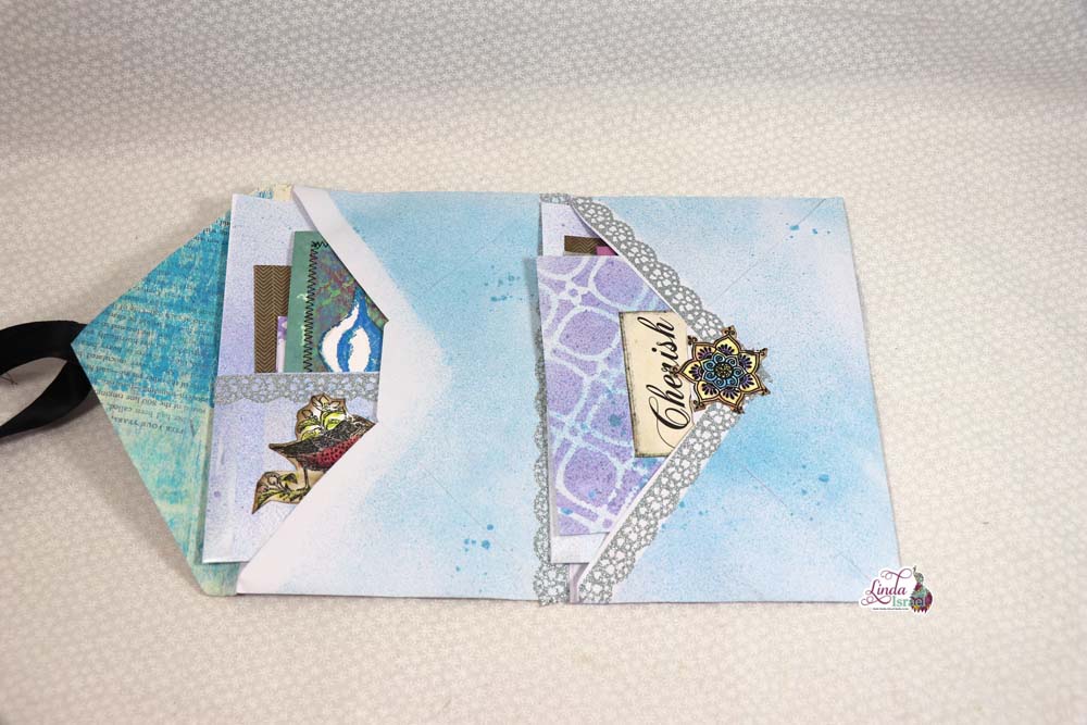 The invitations I used had cards with pockets. These were perfect to add journal cards and mop page turned into stationary.