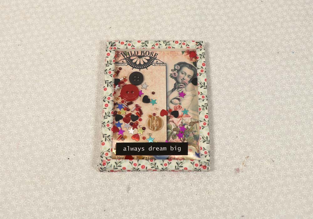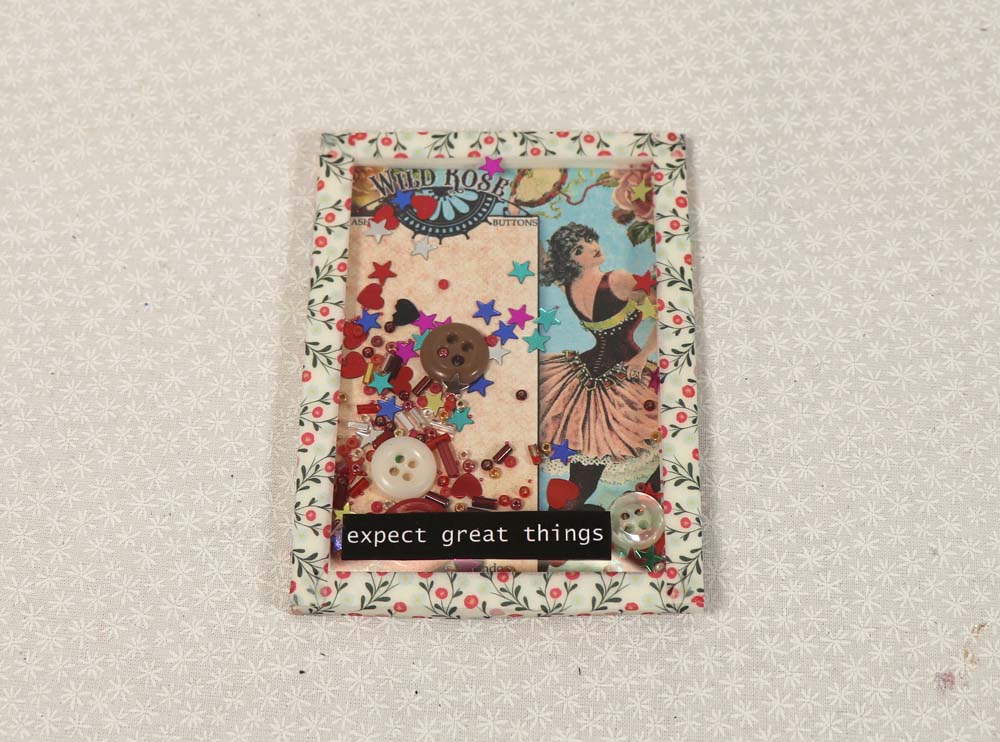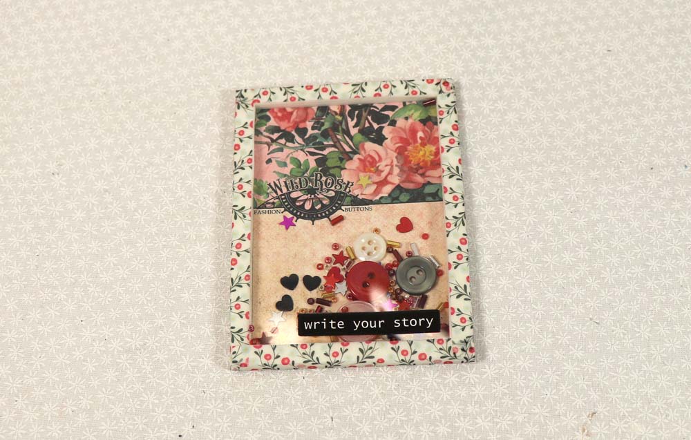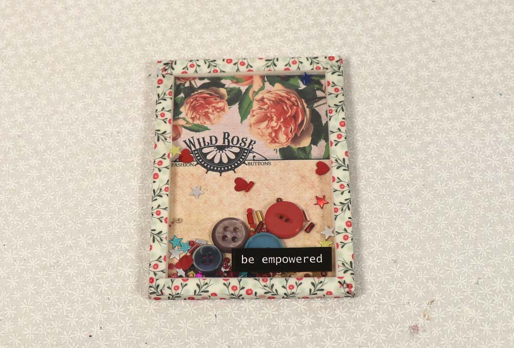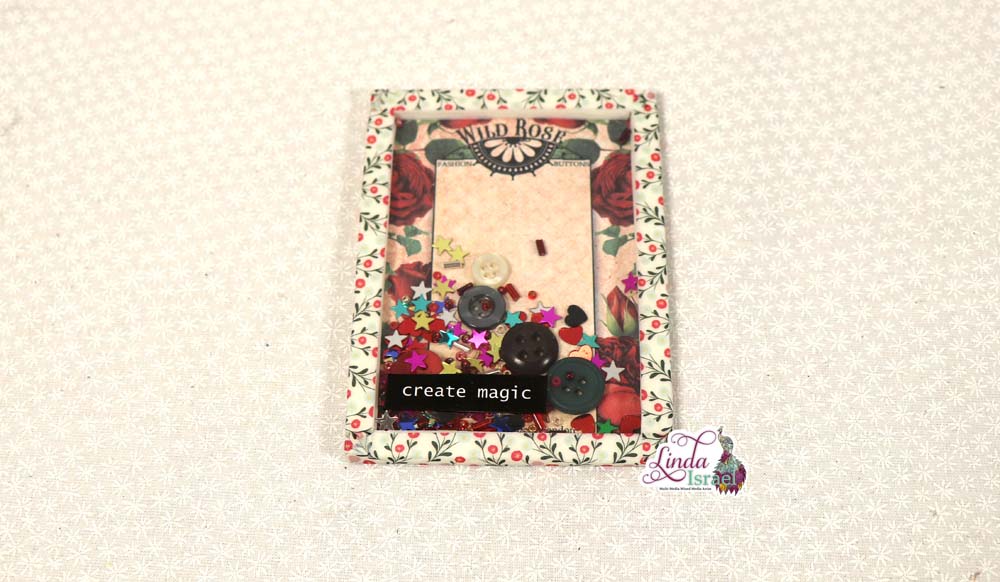 Linda applied a black on white inspirational word to the top of the shaker card. You can add whatever you want to the outside of your shaker card to dress it up, however these are being made for a journal so keeping the embellishments simple is a good idea.