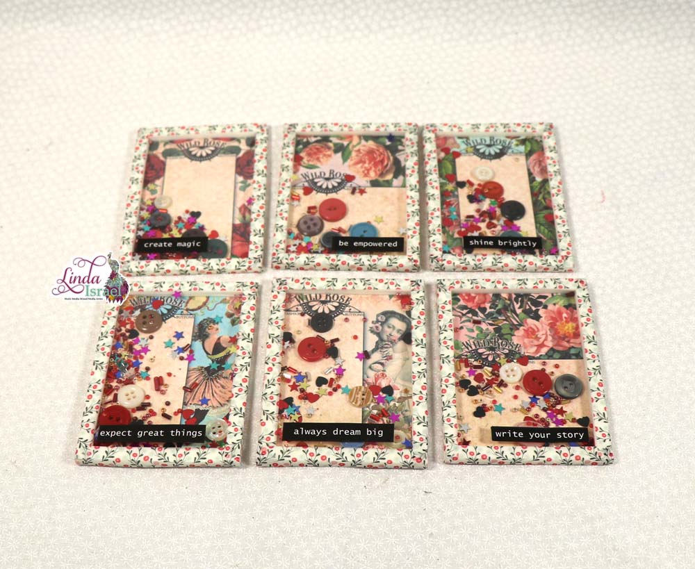 Day 9 Shaker cards for Junk Journals of 12 Days of Junk Journal Gift Ideas. Using Calico Collage Digital Images, beads, buttons & confetti, Linda shows how quick and easy it is to create these cute Shaker Cards.