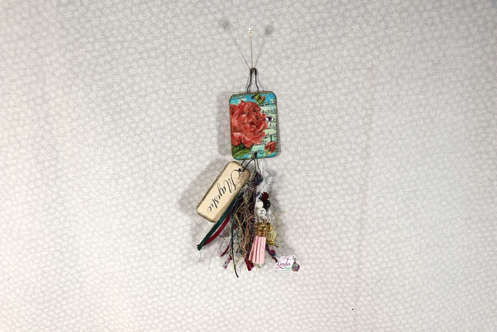 I found a package of printed little tags when I was cleaning and thought it would be good to put one on this page. The right side of the page is a piece of tissue that I sprayed with Tattered Angels Glimmer Mists then Rubber stamped a few flowers with leaves and a text stamp. Then I used watered down Aleen’s Tacky glue and painted a plastic bag, while it was wet I laid the tissue on the glue. Add another layer of glue on the top side, push the edges in to create texture so it is easy to pull up then allow to dry. Doing this technique strengthens the tissue paper and makes a cool crinkle sound when added to a journal.