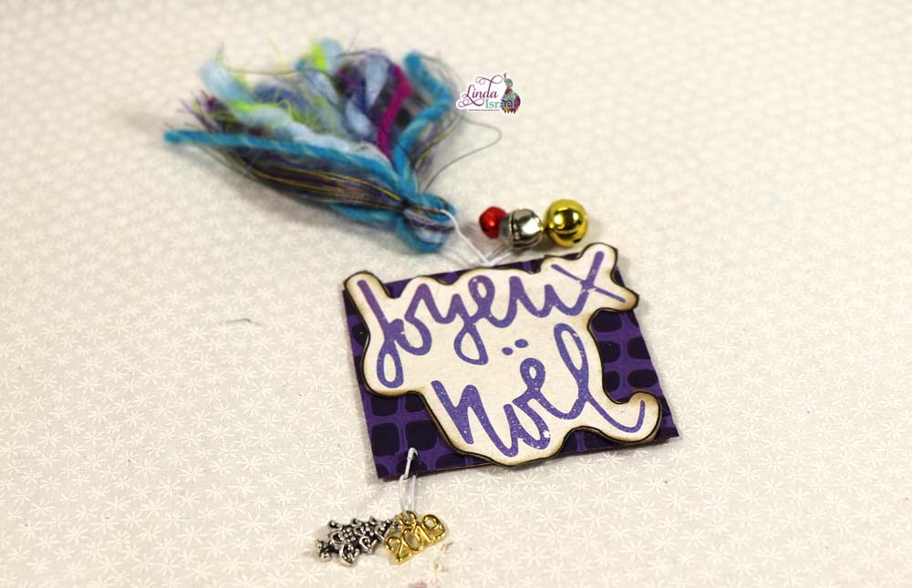 Demonstrating how to create the base of the altered paper clip, using Aleene’s tacky glue, Linda adhered some festive word elements that included in the A Christmas Peacock subscription box,
