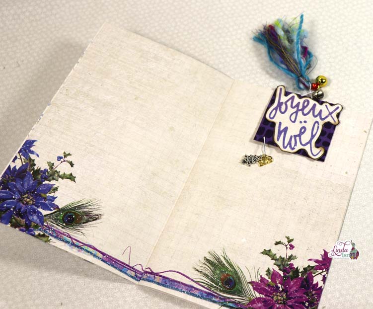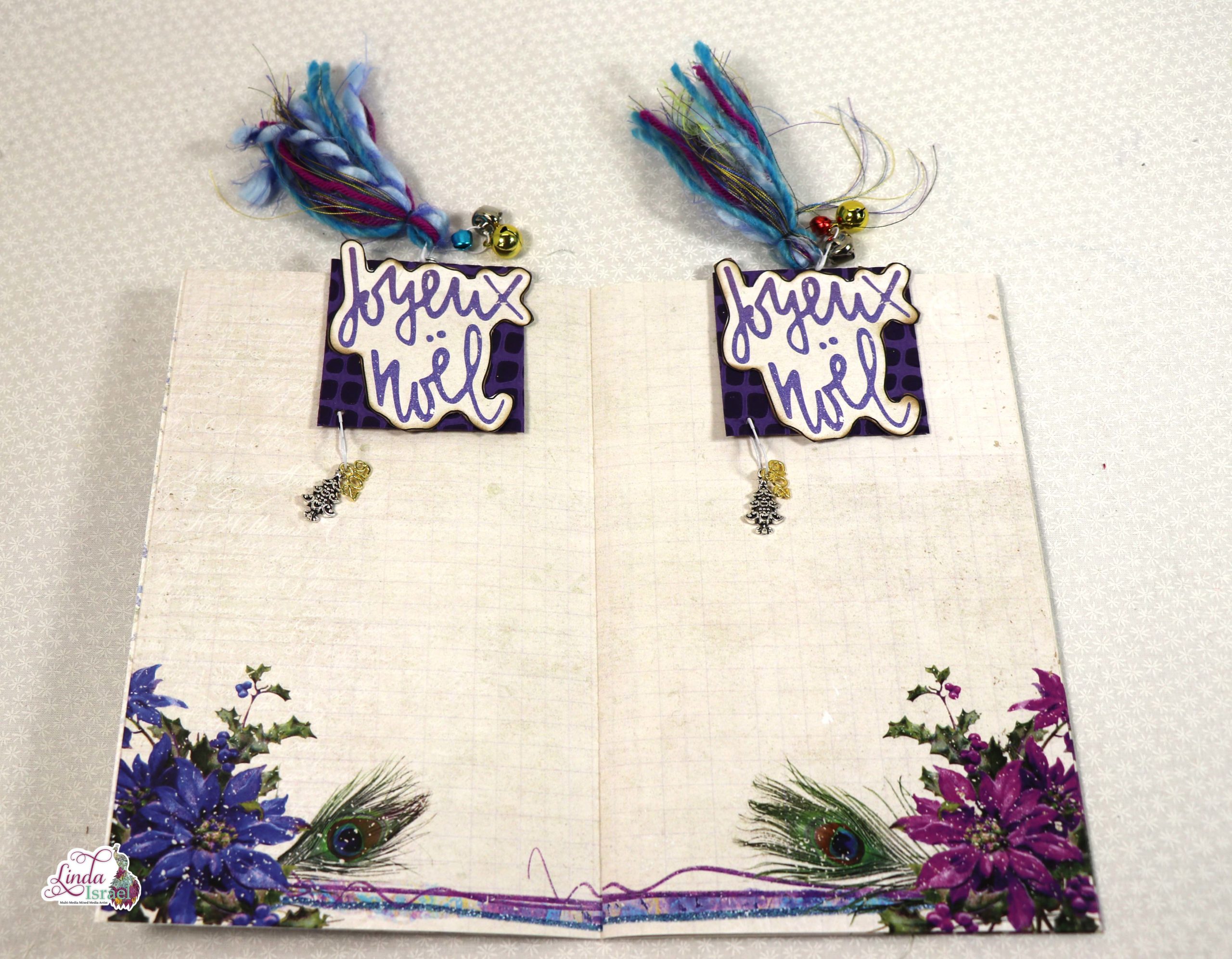 Taking the bulb pins, tiny jingle bells, fibers and charms from the kit, Linda attached them to the outside edges of the altered Paper Clip. The kit comes with enough fibers to create little tassels for your altered paper clip. These altered paper clips are great elements to use in your journals!