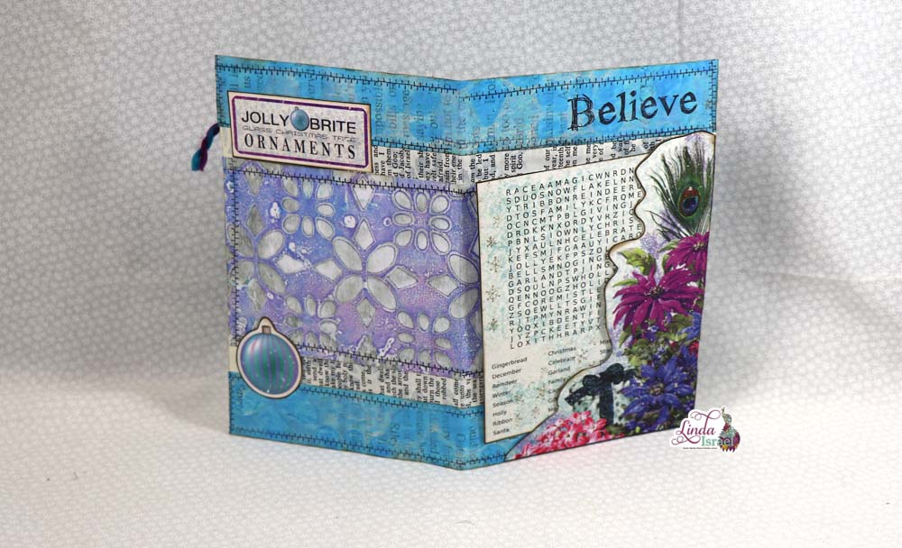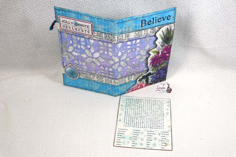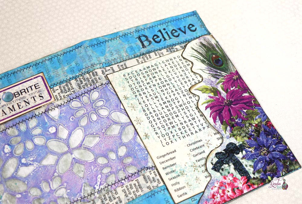 Linda stamped the edges of this journal page with the shabby stitches and Believe from the Christmas Quartet rubber stamp set. Creating a journal page with fun elements, the words search in the Christmas Peacock add on journal kit is great element to use in tuck spots!