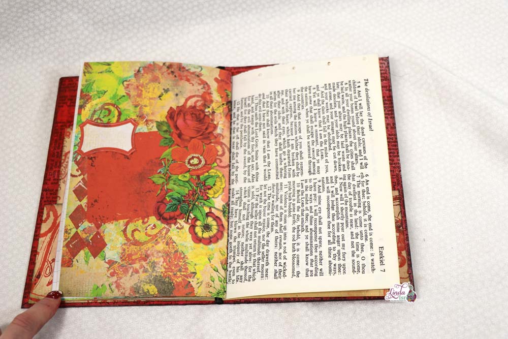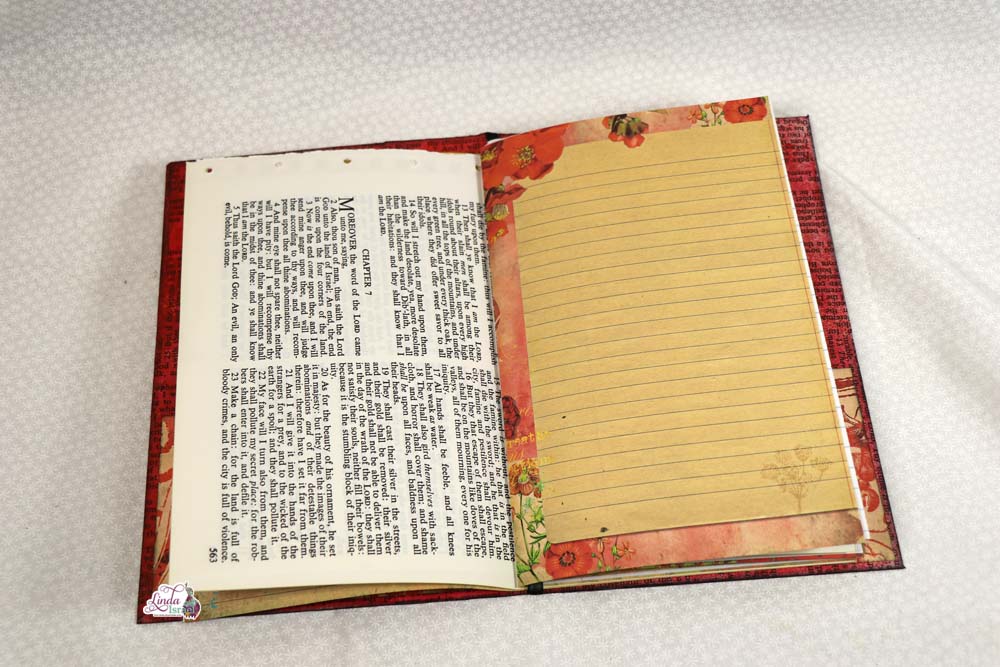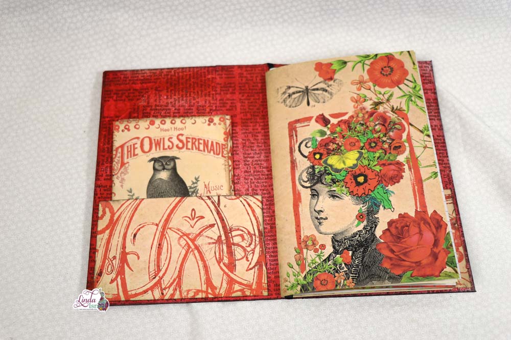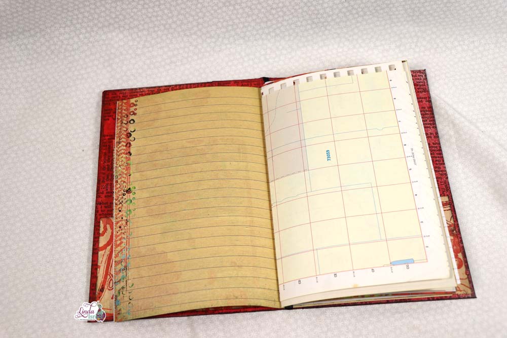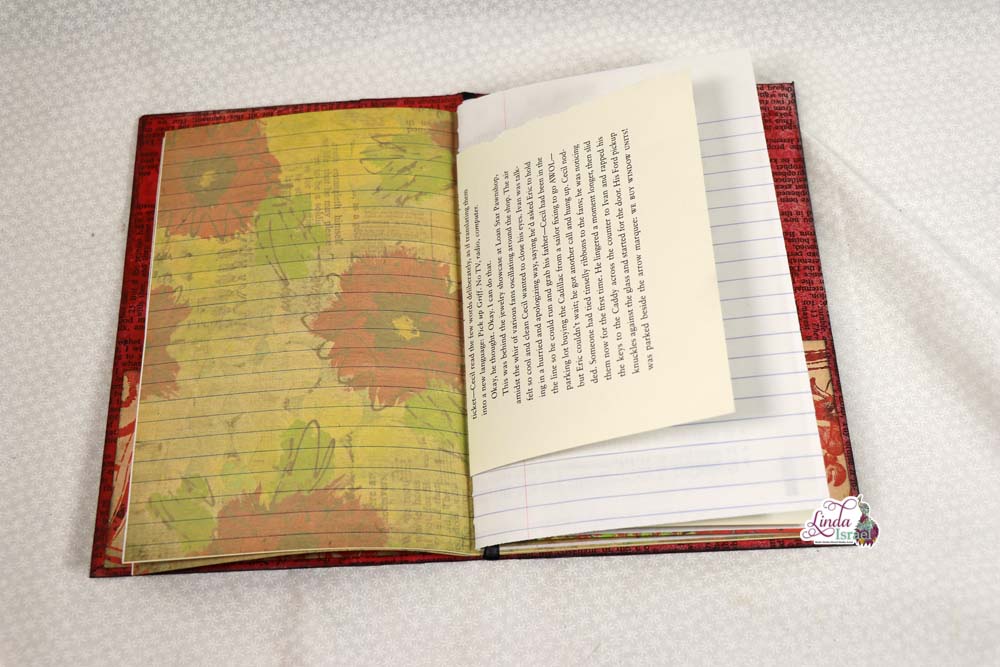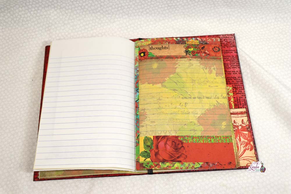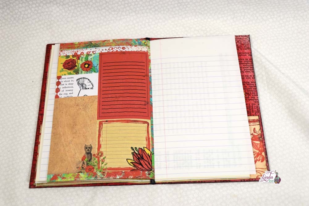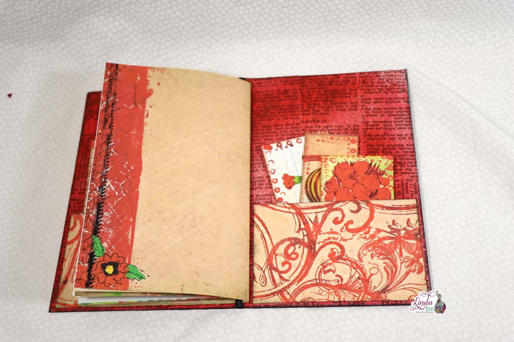 For the cover of the composition notebook, Linda chose to use the Radiant Red digital download that is available in her shop. Keeping the journal relatively simple, she has added a few pockets and tuck spots that can be used for the upcoming Creative Prompts in January.