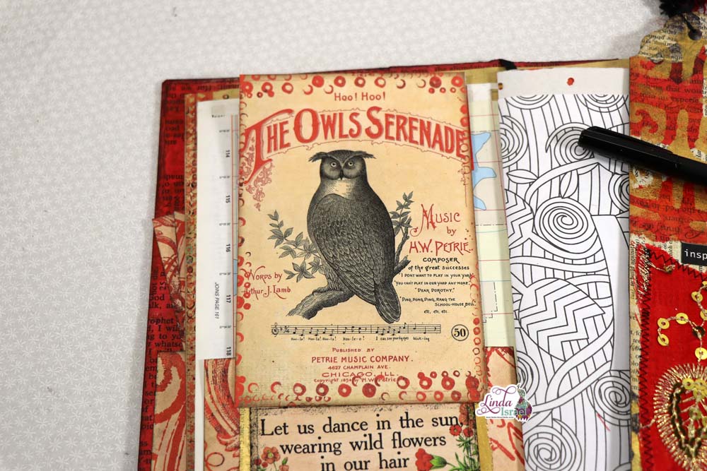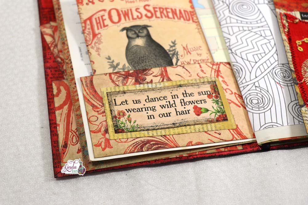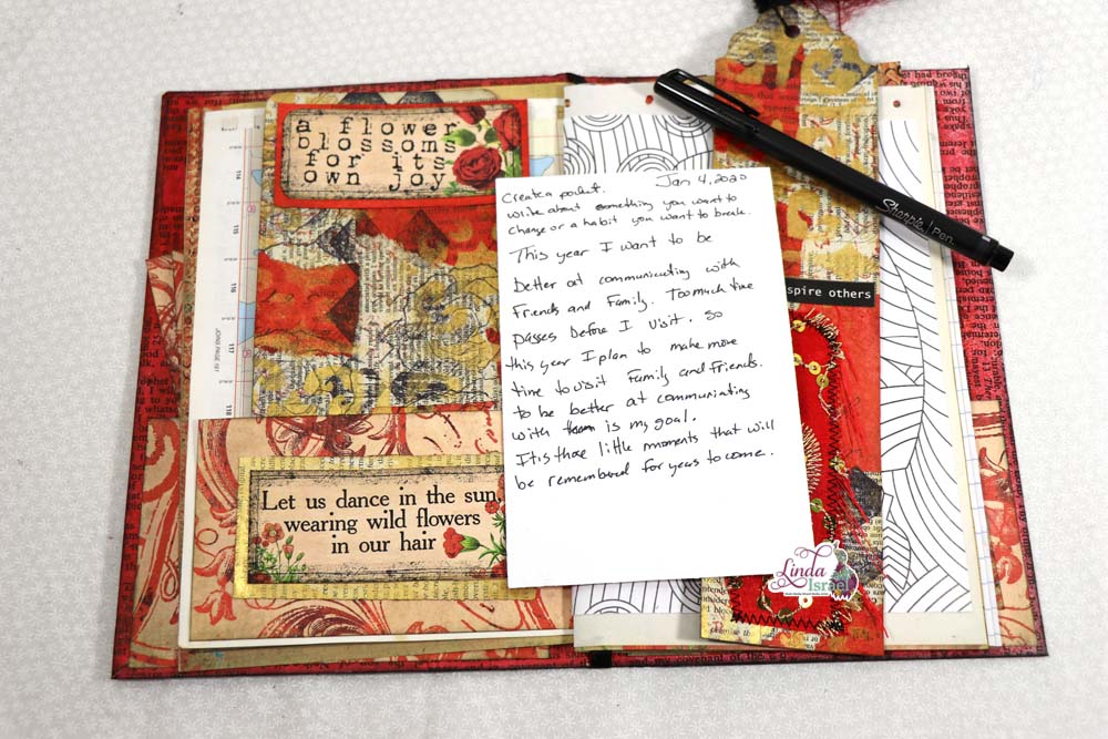 The Creative Prompt for today is to Create A Pocket for either a journal card or tag. Take the journal card or tag you created on January 3rd, place it inside the pocket. You are to add another journal card or tag and write about what you would like to change about yourself or a habit you want to stop doing. Linda shows how she created her pocket using the Radiant Red Digital Kit images and scrap paper.
