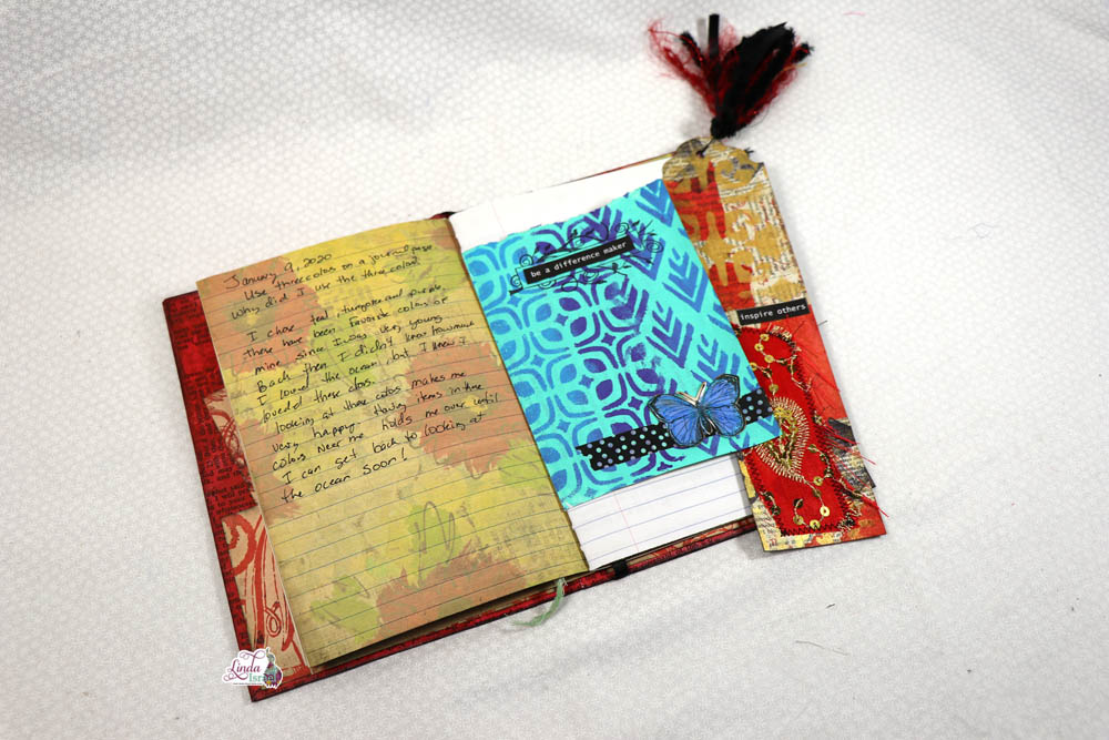 Choosing three of her favorite colors for today’s prompt, Linda shows us how to layer the colors to create a junk journal page.