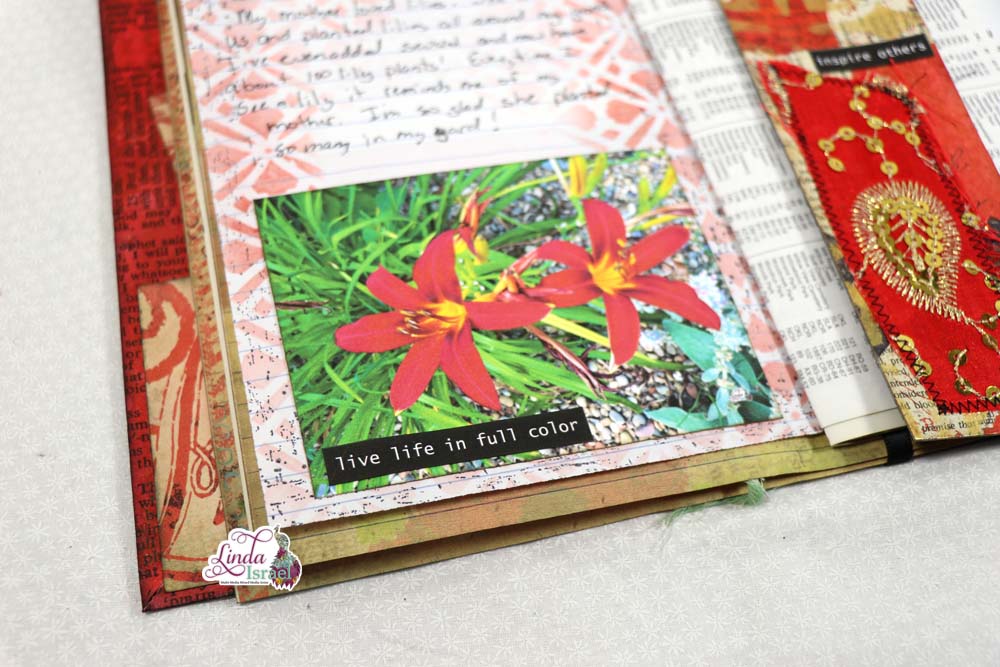 Using a stencil, distress ink, a rubber stamp with a photo of her favorite flower, Linda shows us how she creates today’s journal page!