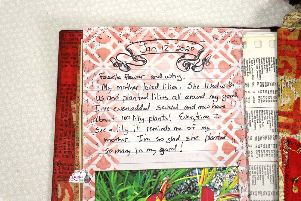 Got scrapbook paper that is too busy? Try attaching another paper on top to tone down the pattern and create additional writing space. Then accent the piece with a stamp, like the Tulip Twine that Linda used.