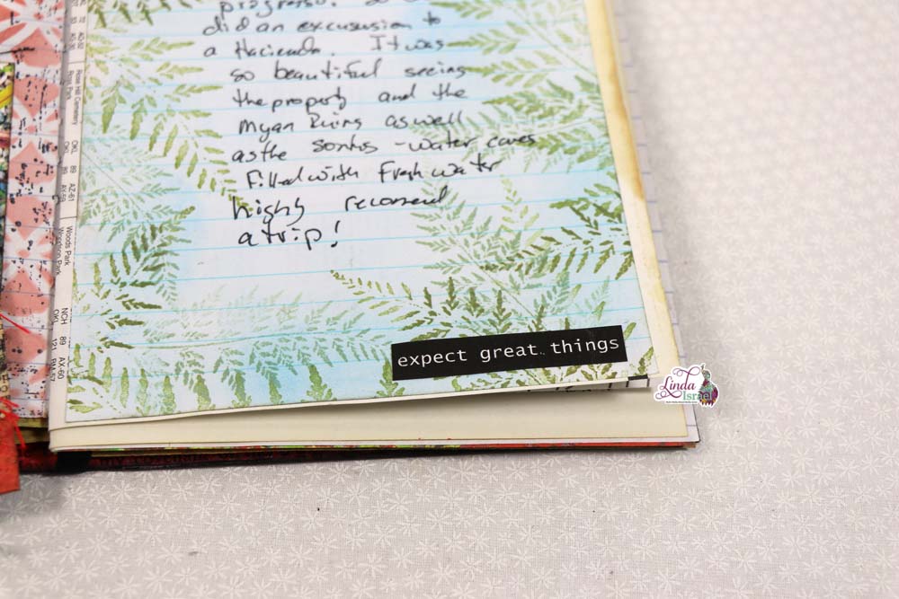 The page on the right features stamping with the Henna Rose and stenciling from the December 2021 Stencil Club. Expect Great Things is a phrase from the Dream Big QT. Layering scraps of paper on top of each other gives a nice touch to the page.