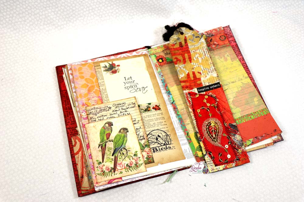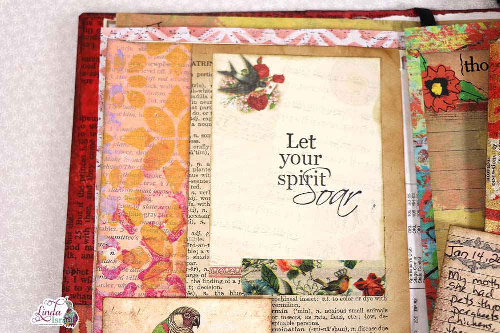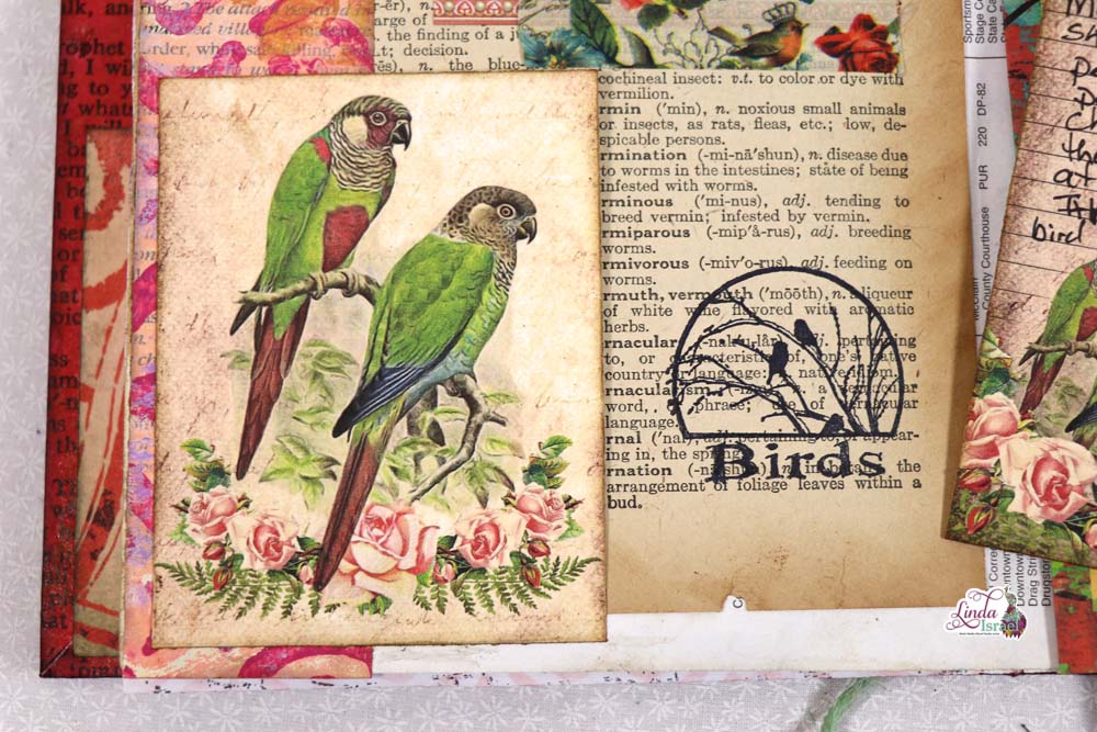 Using various items from her stash, like a Book page and Rubber Stamps, along with Calico Collage Song Bird Digital Journal Kit Download, Linda shows us how she created a bird themed journal page