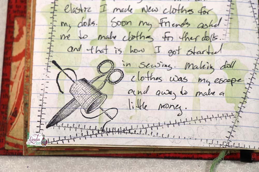 Adding an addition rubber stamp from the Sewing Cube stamp set, Linda kept to the theme of her prompt page. Using rubber stamps will add interest to your journal pages, try using a few that you have for your pages.