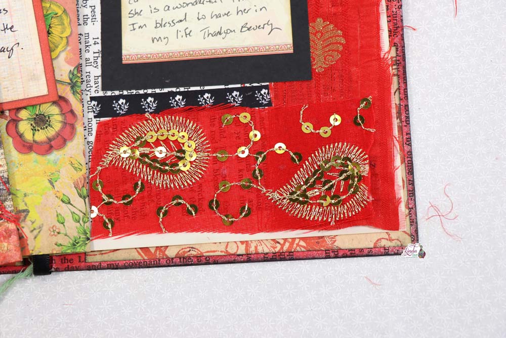 Taking pieces of sari silk fabric scrap pieces from Dust Fairies, Linda shows how she uses them for today’s journal page. There are many different ways you can use your fabric scraps in your journal!
