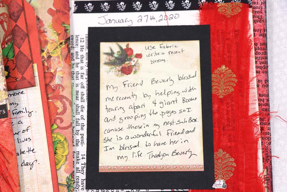 January 27 Prompt Use fabric scraps to create something for or on your journal page. Write about a blessing you received recently.