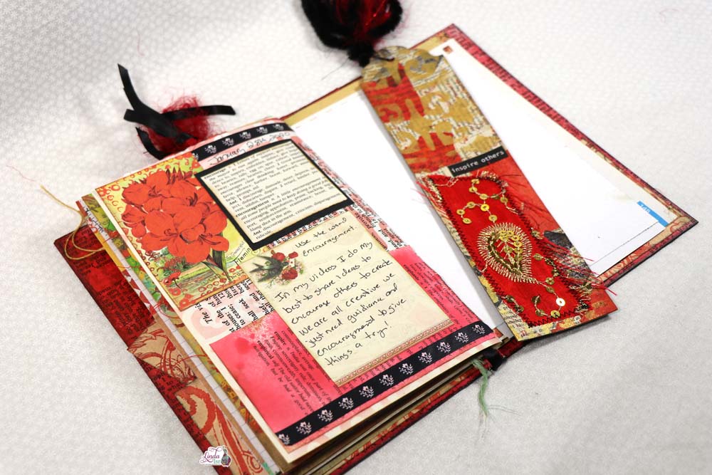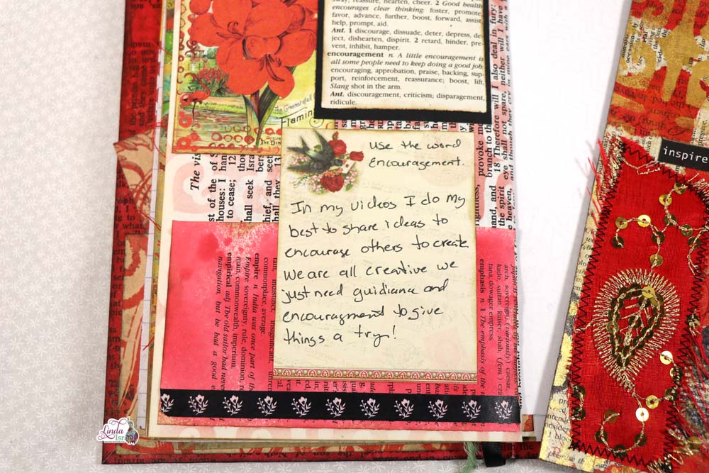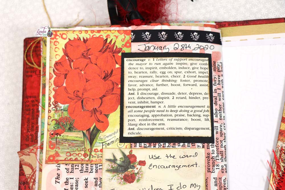 Adhering the definition of encouragement from a dictionary with Aleene’s tacky glue with an element from the Radiant Red Creative Kit.  Don’t worry if you do not have the exact materials that Linda is demonstrating, there are always ways you can use items from your stash to create textures and designs to your journal pages. For example if you do not have Washi Tape, try a piece of ribbon or paint lines instead!