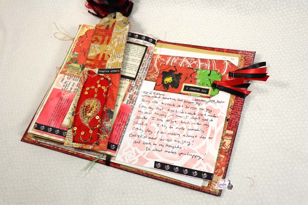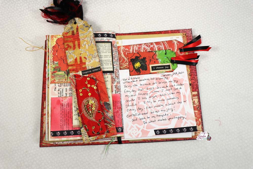 Using black and red ribbon, Linda shows that you don’t need a hole punch to attach ribbons to your journal tags, a stapler works just as well!