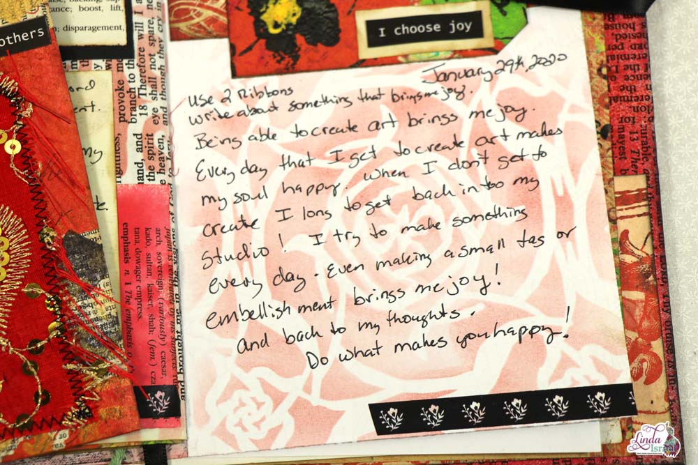 January 29th Prompt is to create a journal page using at least 2 ribbons or ribbon scraps. Write about something or things that bring you joy.